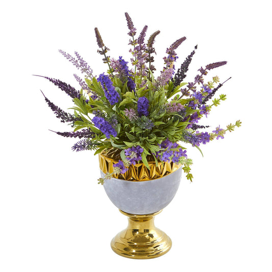 22” Dutch Tulip Artificial Arrangement in Stoneware Vase with Gold Trimming