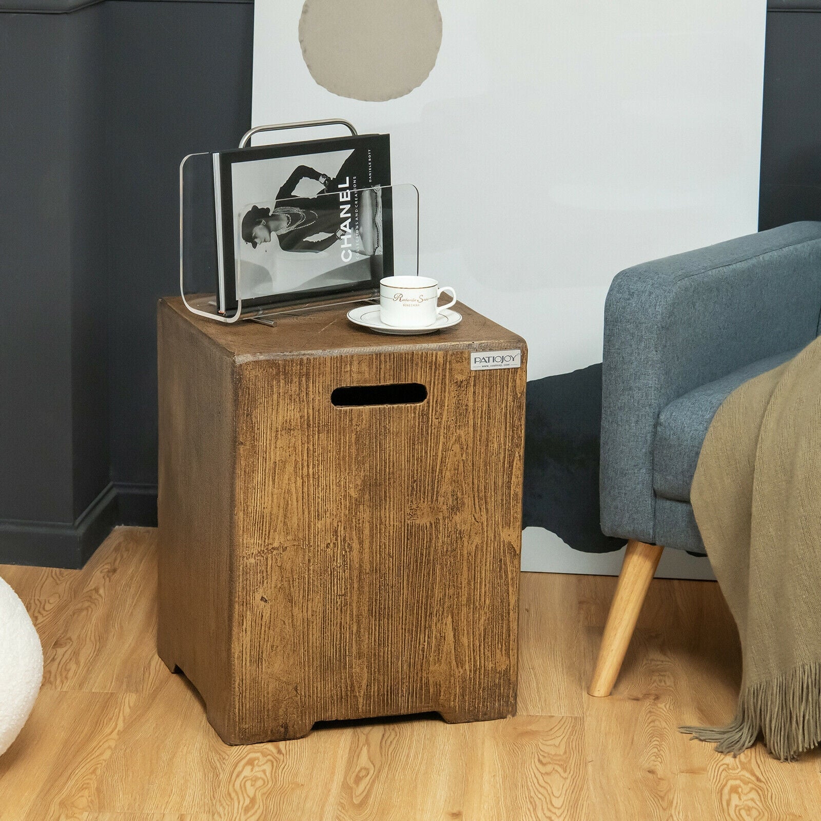 This 16" outdoor hideaway table combines aesthetics and practicability! For practicability this outdoor furniture with side handles not only serves as hideaway table to hold a standard 20 lbs propane tank (not included) but also can be used as a side table to access different belongings easily. As for aesthetics the nature wood grain pattern adds a rustic touch to your outdoor places. Furthermore the adjustablefoot pads allow you to use this patio side end table on the uneven ground. What’s more the flame-retardant magnesium oxide ensures its safety and durability. If you are looking for an outdoor hideaway table like this do not hesitate to place an order! Perfect hideaway storage for 20 lbs propane gas tank (not included) The gap underneath the cover for hose placement Easy to move through convenient side handles Serves as an outdoor side table for practicability Puts various items with ease because of its 30 lbs weight capacity High quality and flame-retardant magnesium oxide for durability and security Waterproof surface for easy maintenance Can be used on uneven ground with adjustable foot pads Simple yet rustic style brings out the perfect taste of life Great for patio garden backyard and poolside etc No need to assemble for time-saving