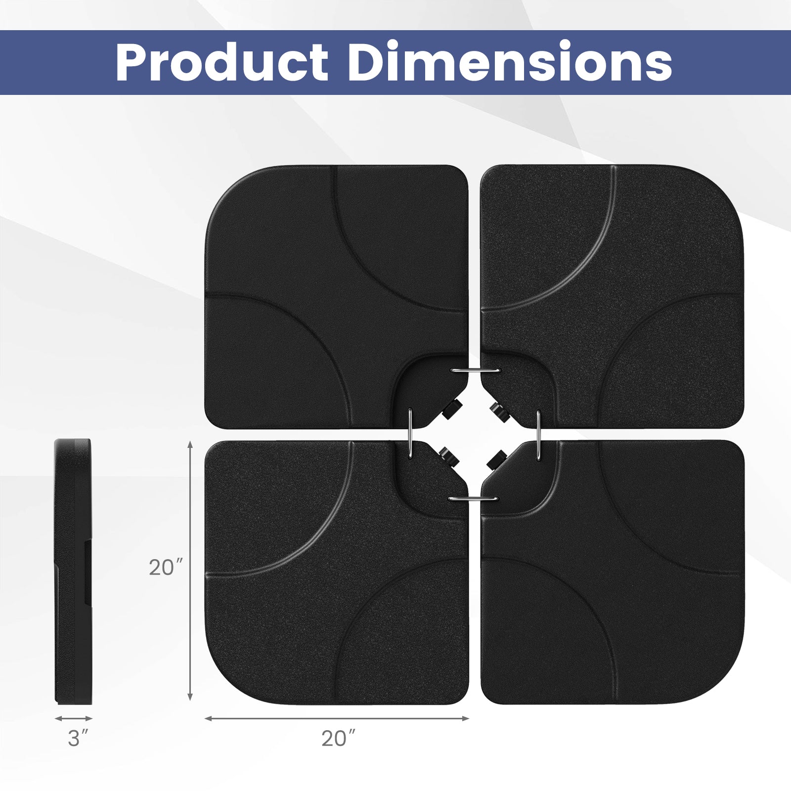 ● Detachable 4 Plates: The umbrella weight is compatible with offset umbrellas equipped with a cross base. 4 detachable plates can be stacked together for storage with less space taken.● Study Construction: The offset umbrella base is made of heavy-duty HDPE plastic which is rugged and weather-resistant sun-protection that prevents cracking and is easy to maintain.● Fill Water or Sand: The cantilever umbrella base can weigh up to 180 lbs when it is filled with sand and up to 130 lbs when filled with water so your outdoor umbrella will remain upright in heavy winds.● Easy-to-Fill Spouts: Each plate has a fill spout and a twist cap which make the patio umbrella base can be filled easily and quickly.● Umbrella Stand for Cantilever: Overall dimensions: 41"(L) x 41"(W) x 3"(H). Dimensions of per plate: 20"(L) x 20"(W) x 3"(H). A versatile essential for lounging beneath an offset umbrella.