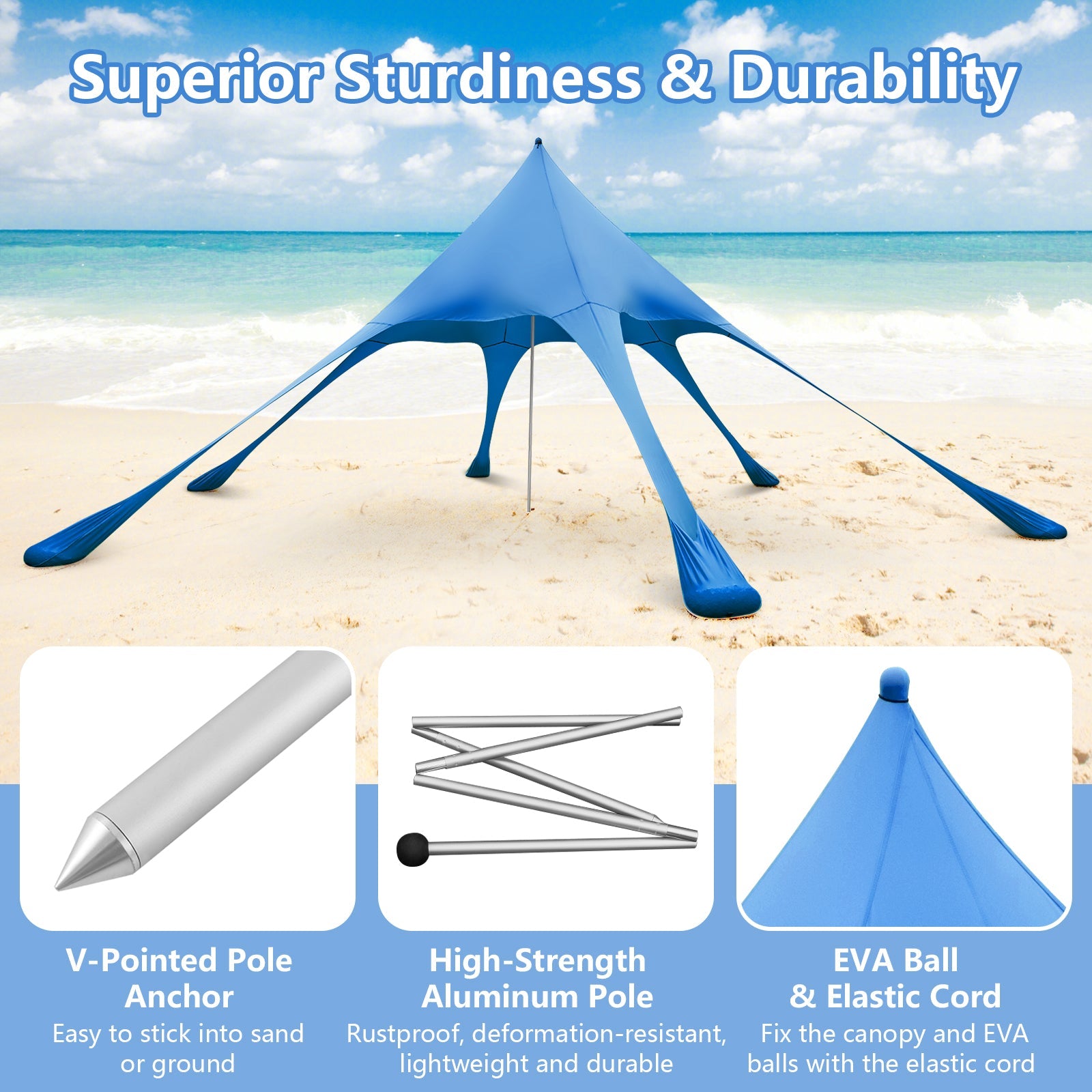 ● Spacious space & complete accessories for easy use● Fits 2-3 people to use● 6 sandbags and 6 ground stakes keep it stay stability on different terrains● Superior to other beach canopies with ordinary sun resistance 4 sandbags and 6 ft pole● Sun proof Lycra fabric prevents harmful sunlight● Elastic material enables you to freely move the sandbags and pole to adjust the shade● Quick & easy to set up● The durable aluminum pole well holds the canopy● Light weight and included portable bag for easy carrying● Designed with exquisite sewing and fine workmanship● Comes with 1 elastic cord 1 aluminum pole 1 sand shovel and 6 ground stakes