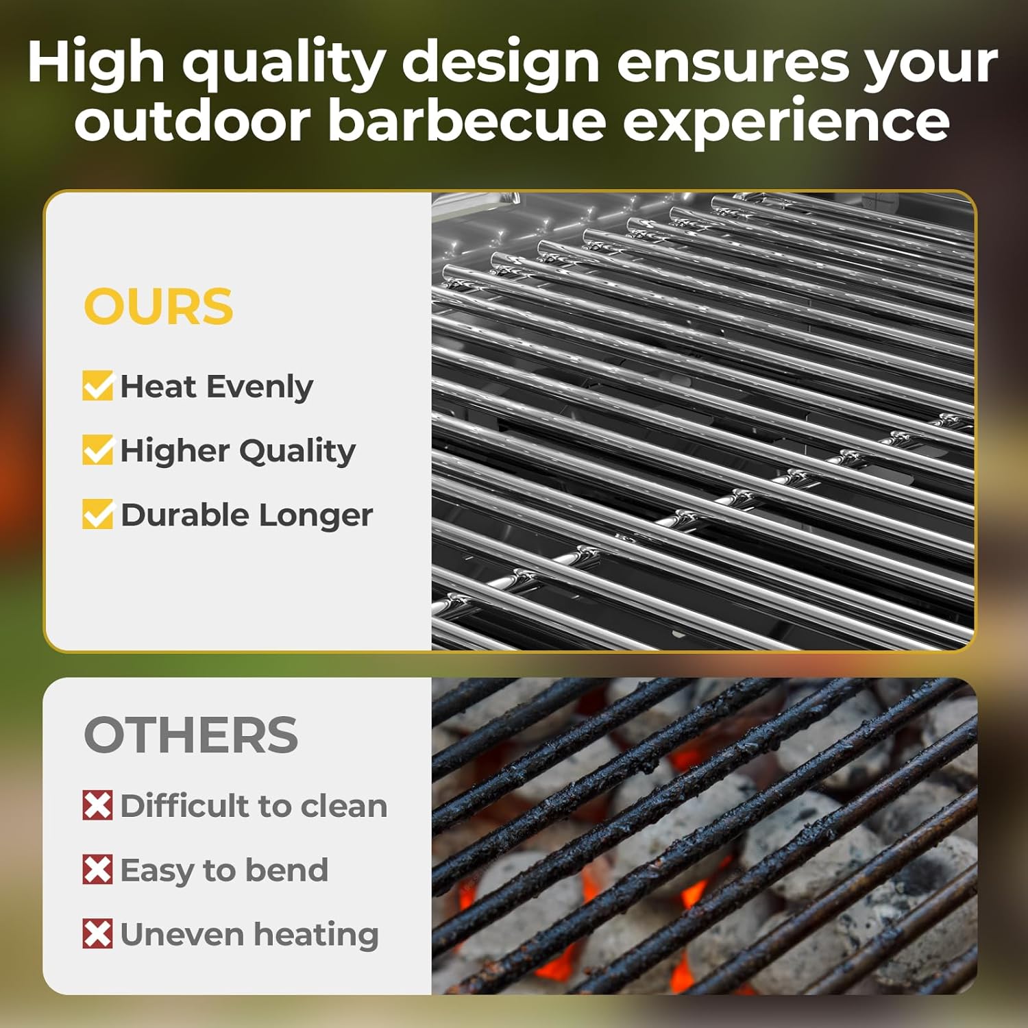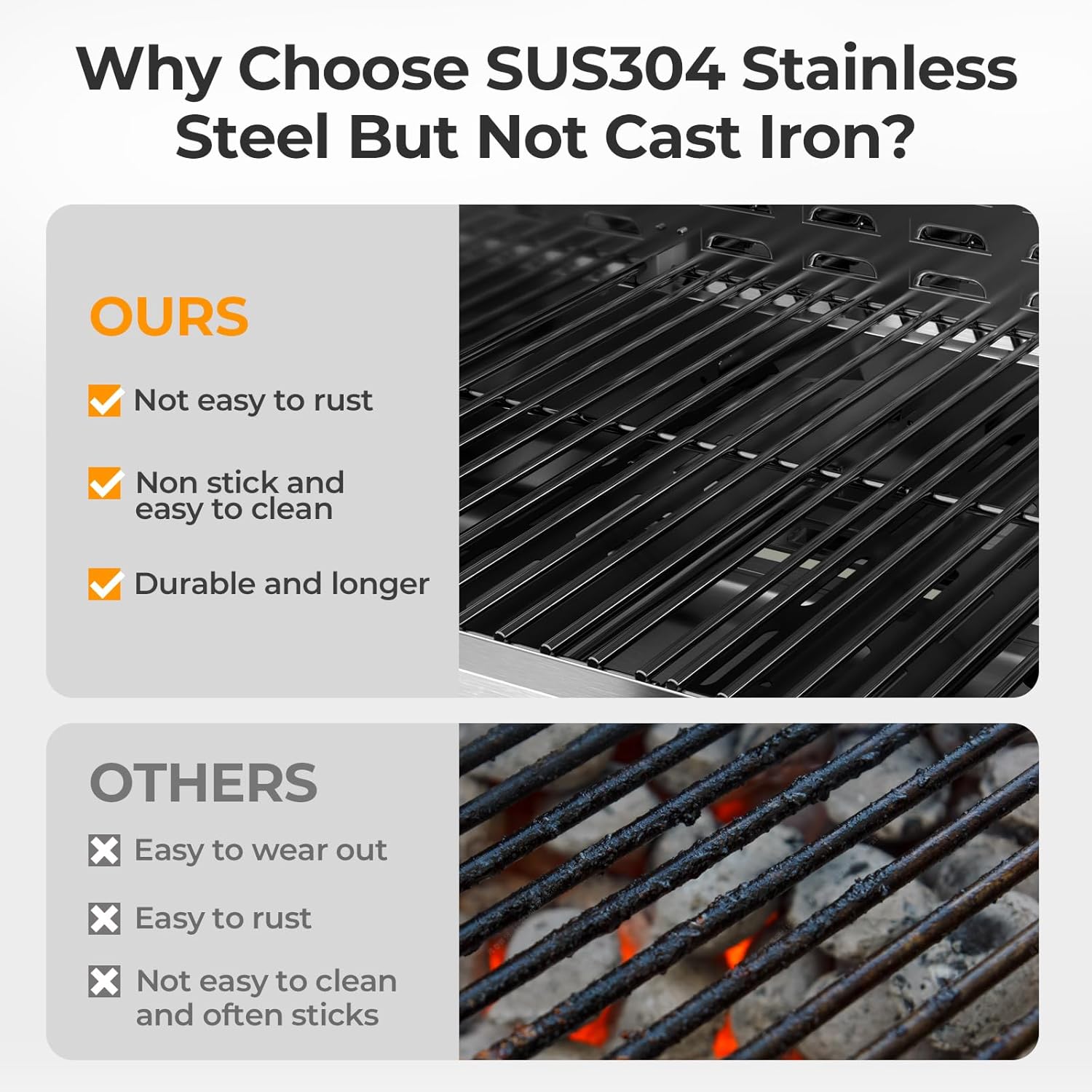 - Parrilla de barbacoa de larga duración: Experimente lo último en parrillas al aire libre con nuestra parrilla premium de acero inoxidable. La estructura principal está fabricada con acero inoxidable 304 de grado alimenticio, ampliamente reconocido como el estándar de oro de la industria en resistencia a la corrosión. A diferencia de las parrillas de menor calidad que utilizan acero inoxidable 430 de bajo costo o metales galvanizados, nuestra parrilla de gas de alta resistencia ofrece una vida útil de 1,5 a 7,5 veces mayor.