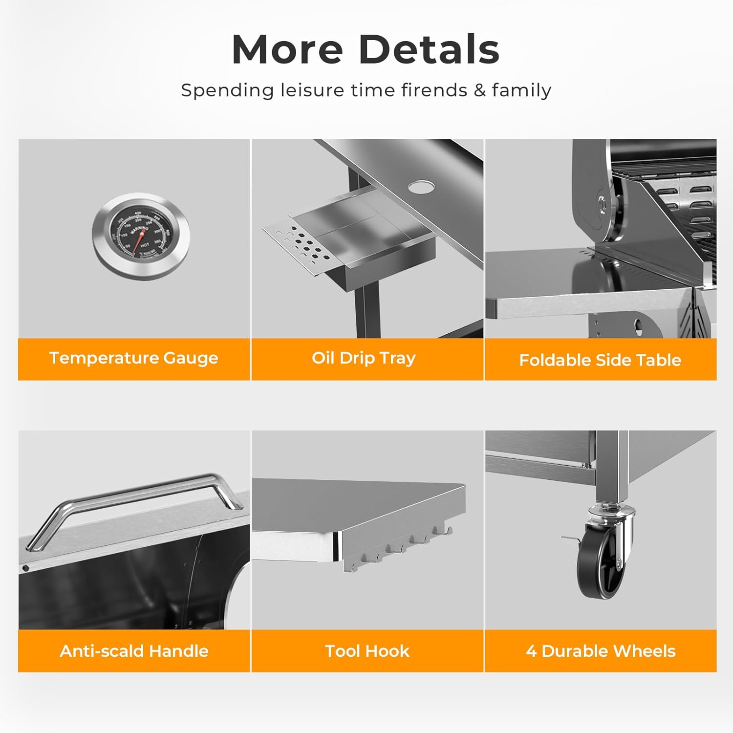 - Diseño único: La exclusiva superficie de acero inoxidable le aporta estilo y durabilidad a la parrilla. La tapa de doble capa garantiza un excelente aislamiento, manteniendo la comida deliciosa y caliente de manera uniforme. El medidor de temperatura integrado permite monitorear la temperatura en tiempo real. La parrilla cuenta con 4 ruedas galvanizadas para facilitar su transporte.