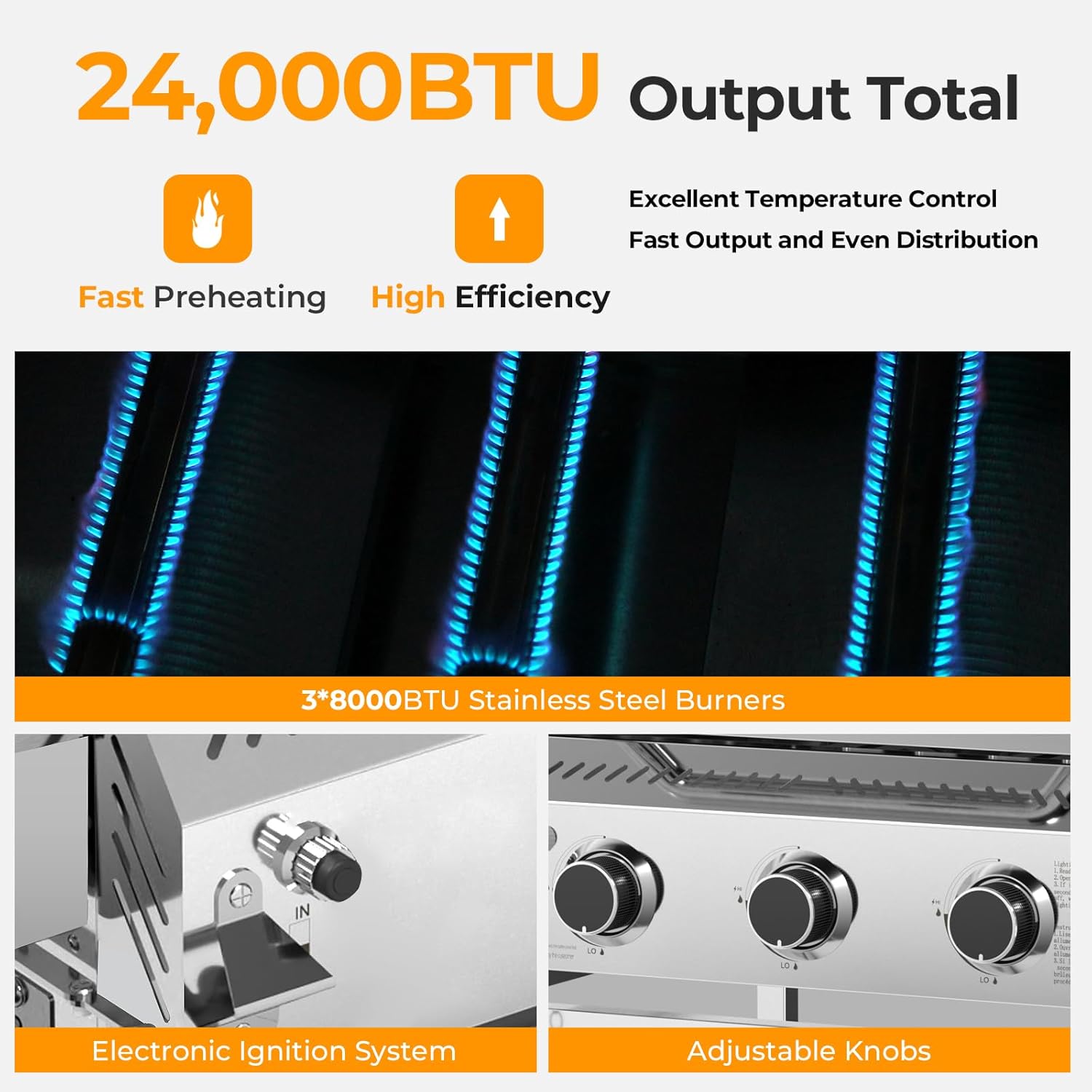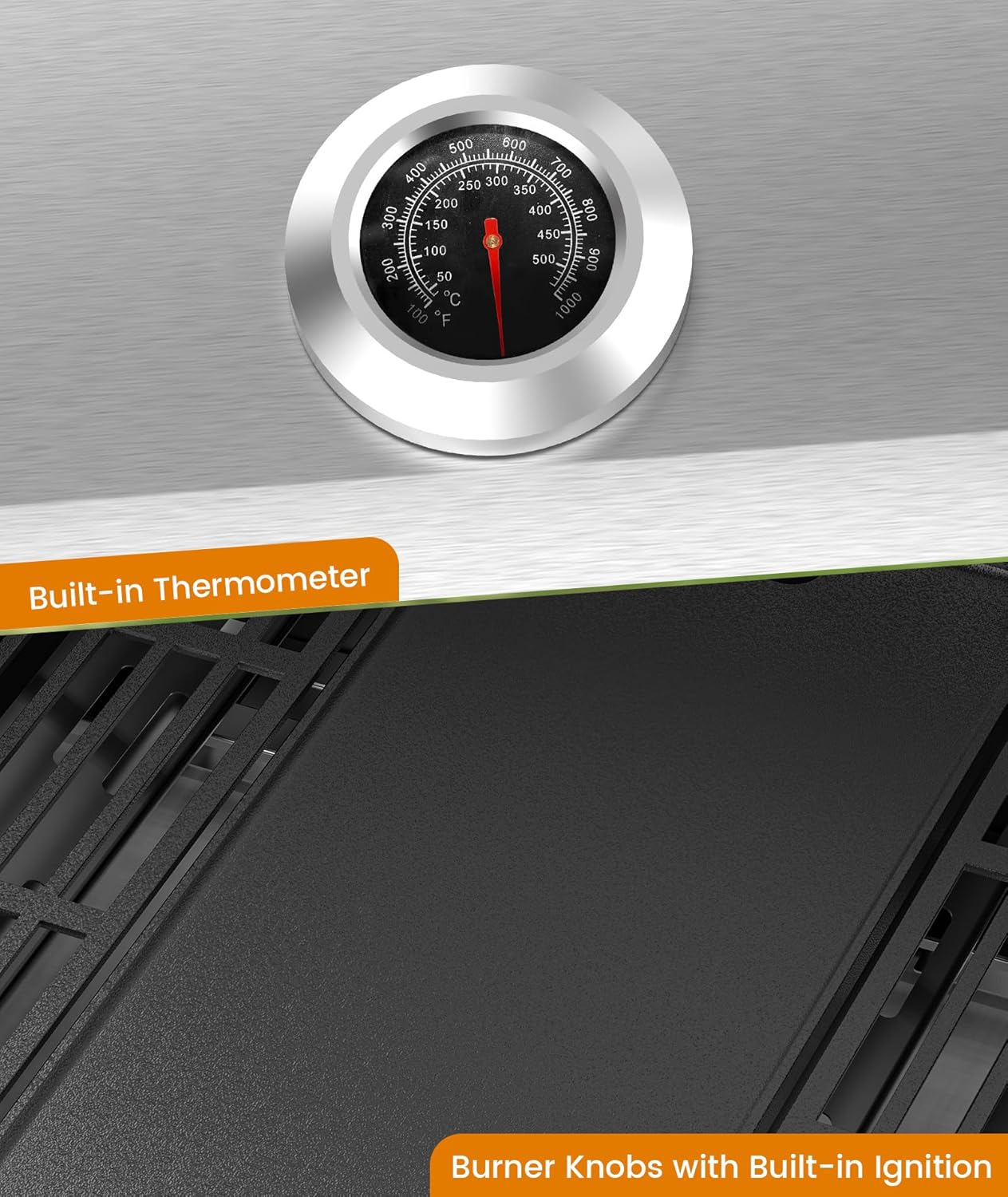 - Calentamiento rápido y uniforme: 3 quemadores principales de 8000 BTU ofrecen una potencia total de 24 000 BTU para un calentamiento rápido en 3 minutos, alcanzando temperaturas perfectas para sellar. Las rejillas de acero inoxidable 304 garantizan una distribución uniforme del calor y un rendimiento antiadherente. 3 perillas de control de precisión y un termómetro integrado en la tapa facilitan la preparación. Incluso los principiantes pueden convertirse en expertos en barbacoas en minutos.