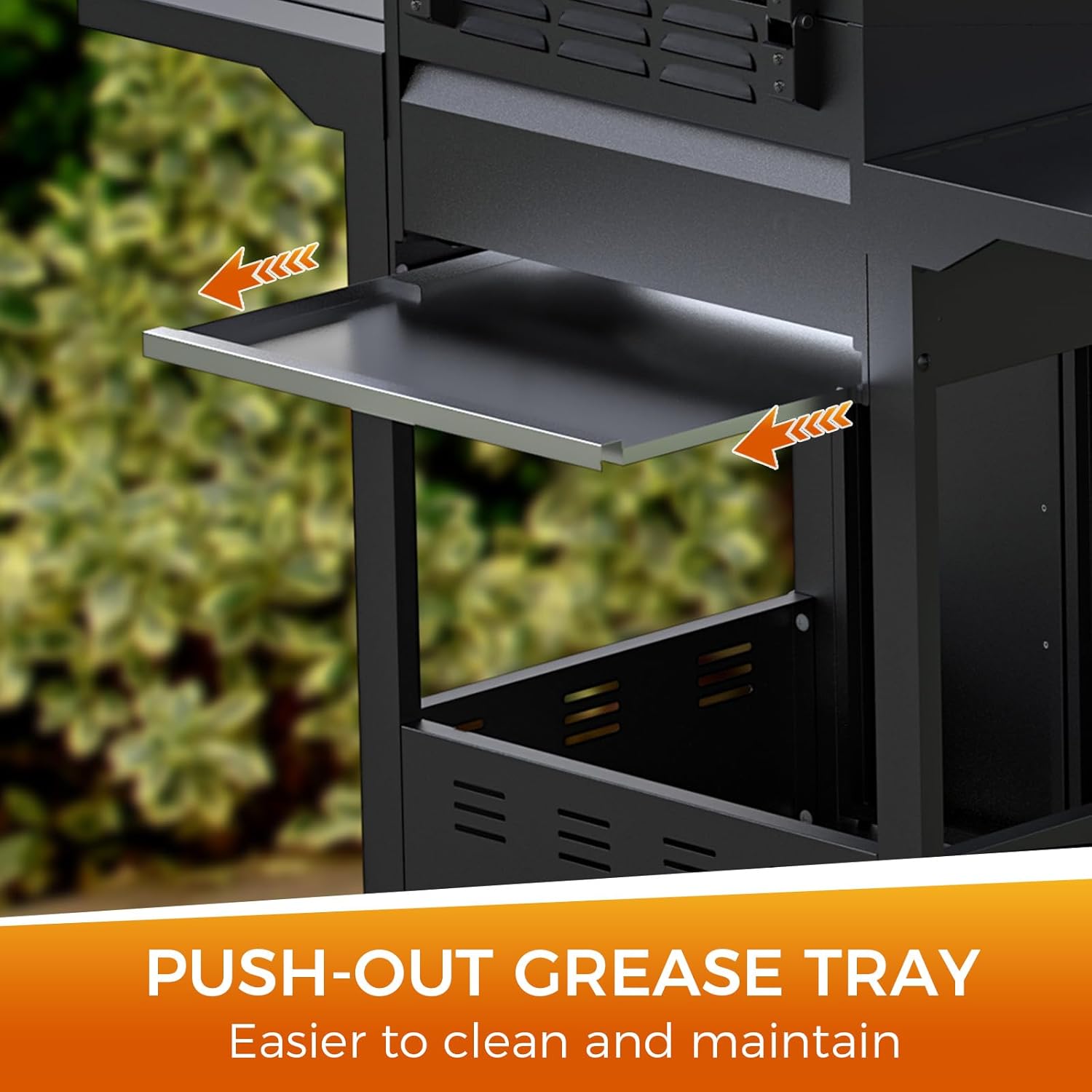 - Fácil de limpiar: la bandeja recogegrasas extraíble de tamaño completo recoge eficazmente la grasa y los residuos mientras cocinas, manteniendo la parrilla limpia. Además, su diseño extraíble facilita y agiliza la limpieza. Extrae la bandeja, vacía la grasa, límpiala y vuelve a colocarla en su lugar. No solo es práctica, sino que también garantiza un rendimiento duradero y el mantenimiento de la parrilla.