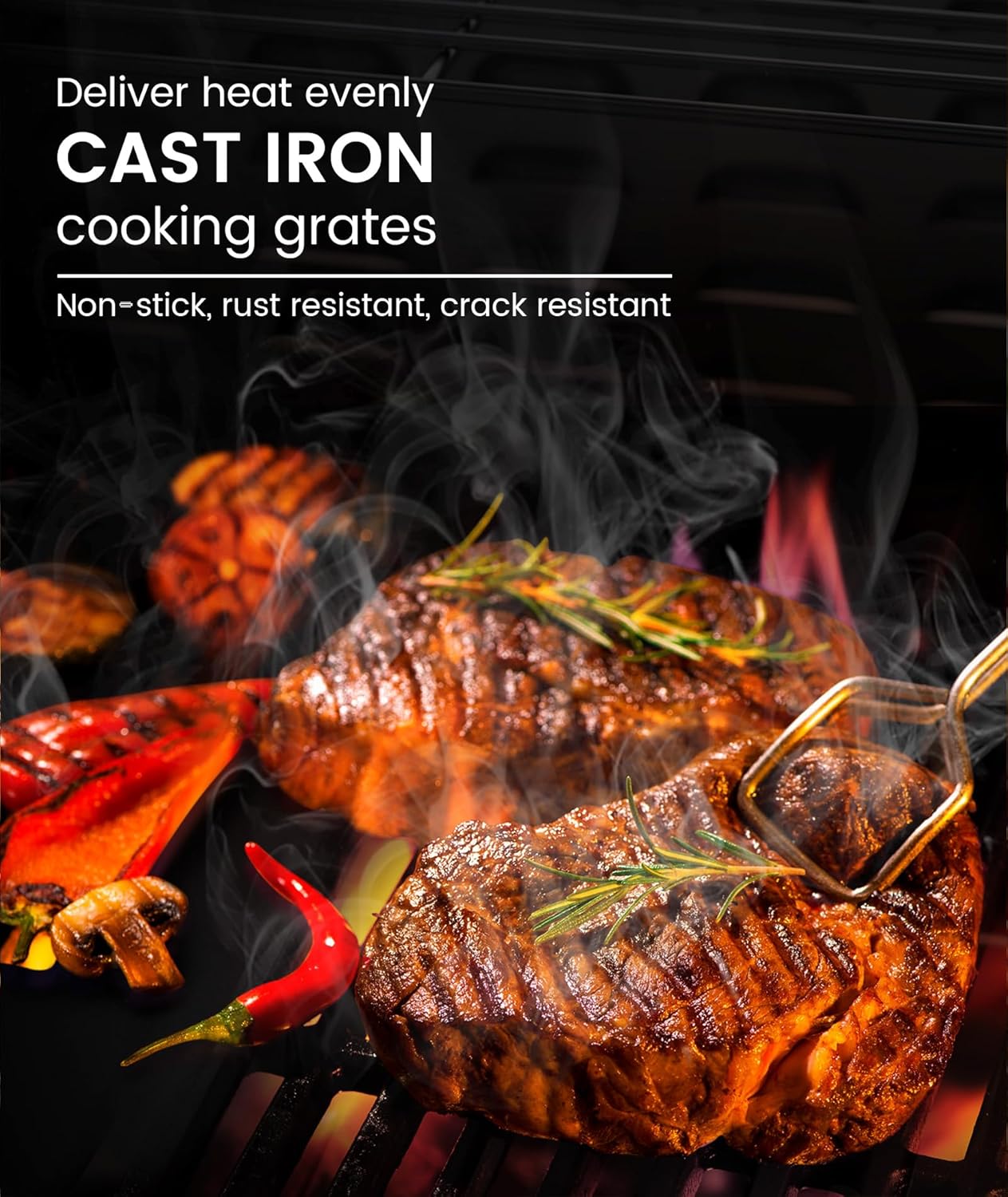 - Amplia área de cocción y quemador lateral: Esta parrilla para exteriores cuenta con cuatro quemadores de acero inoxidable y un quemador lateral. Ideal para diversas preparaciones, como barbacoas y sopas. El área de cocción es de 545 pulgadas cuadradas. Incluye un área principal de cocción de hierro fundido esmaltado de 400 pulgadas cuadradas y una rejilla para calentar de 145 pulgadas cuadradas, también esmaltada. Un termómetro montado en la tapa del quemador principal garantiza una cocción precisa y un asado perfecto. Ideal para pequeñas reuniones o grandes barbacoas.