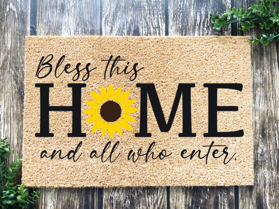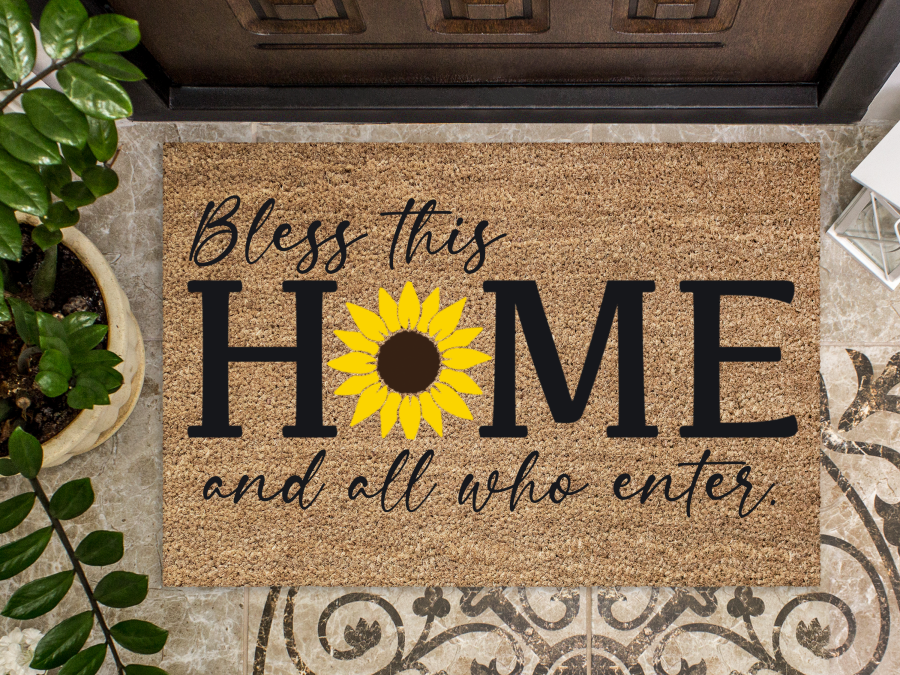 Felpudo divertido, felpudo de fibra de coco, felpudo de bienvenida, regalo de inauguración de la casa, felpudo Bendice esta casa y a todos los que entren, felpudo para la puerta de entrada, felpudo de girasol, regalo para nuevos propietarios DECOE-CM-149