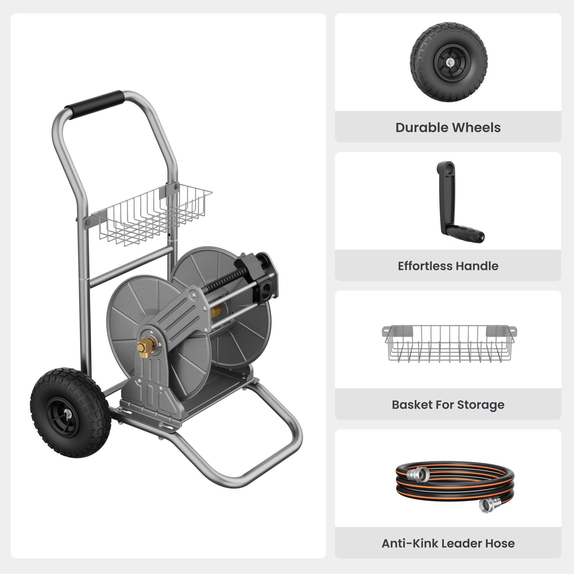 Carrete para manguera de jardín - 2 ruedas - Acero inoxidable - Resistente