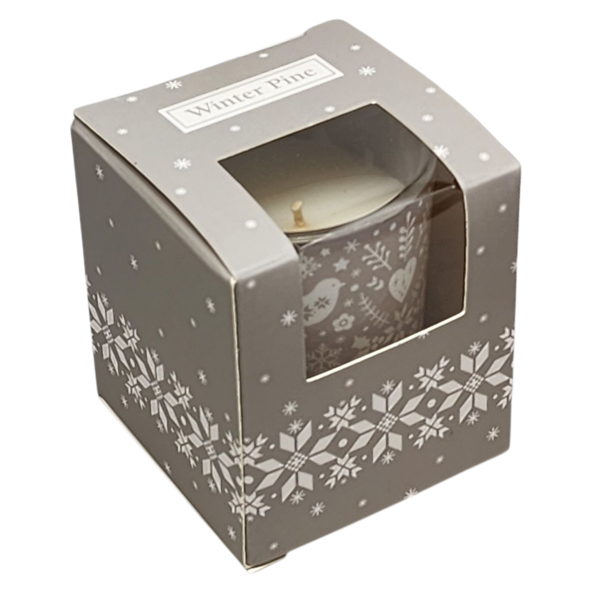 - Comes in a reusable glass holder with a lovely winter design