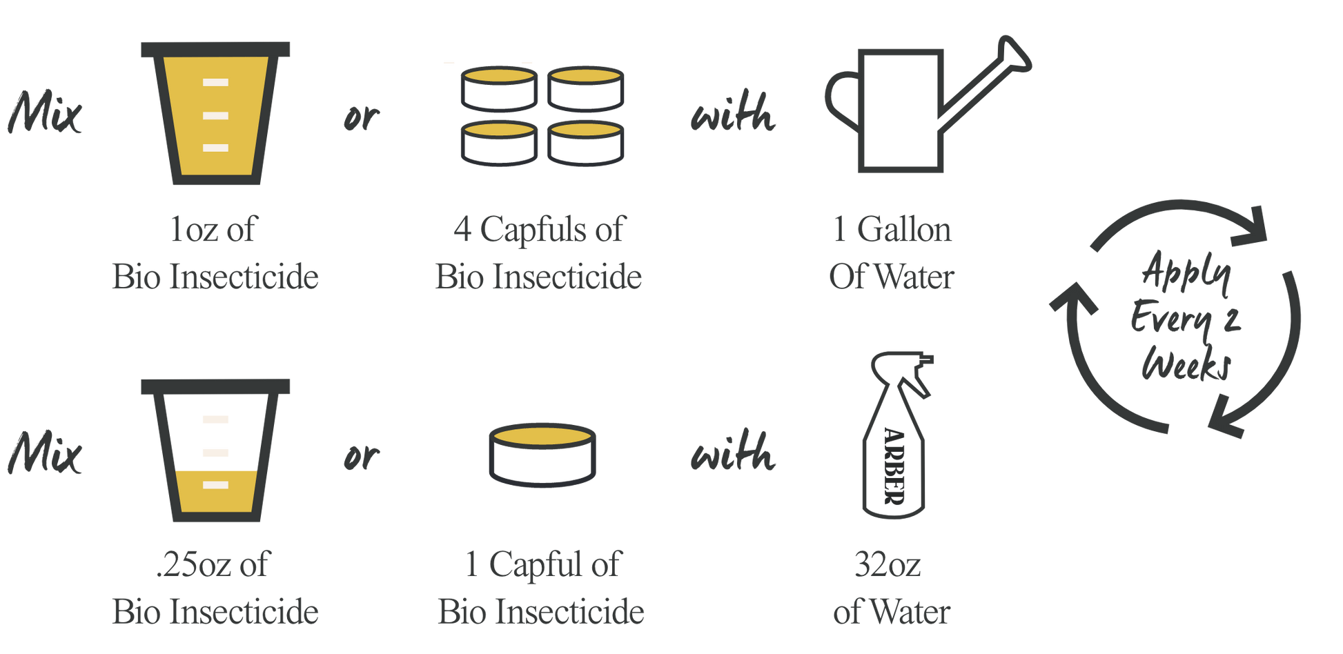 - How to Use: Mix 0.25 oz concentrate with 32 oz water or 1 oz concentrate with 1 gallon of water. Apply directly to soil or leaves. One application every 10-14 days for wellness and every 5-7 days for major infestations.