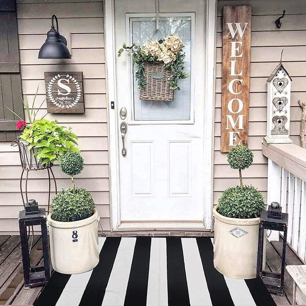 Welcome guests with style and warmth using our oversized Black and White Striped Cotton Outdoor Rug—designed to elevate your porch, patio, or any indoor space with classic farmhouse charm. At 27.5” x 43”, it’s larger than typical mats, perfect for layering with your favorite “WELCOME” or “HELLO” doormat to create a cozy and trendy entryway.Crafted from high-quality, eco-friendly cotton threads, this rug is soft, durable, and suitable for both indoor and outdoor use. Its reversible design ensures long-lasting wear and versatility, while the timeless striped pattern adds a fresh, modern touch to any décor style.