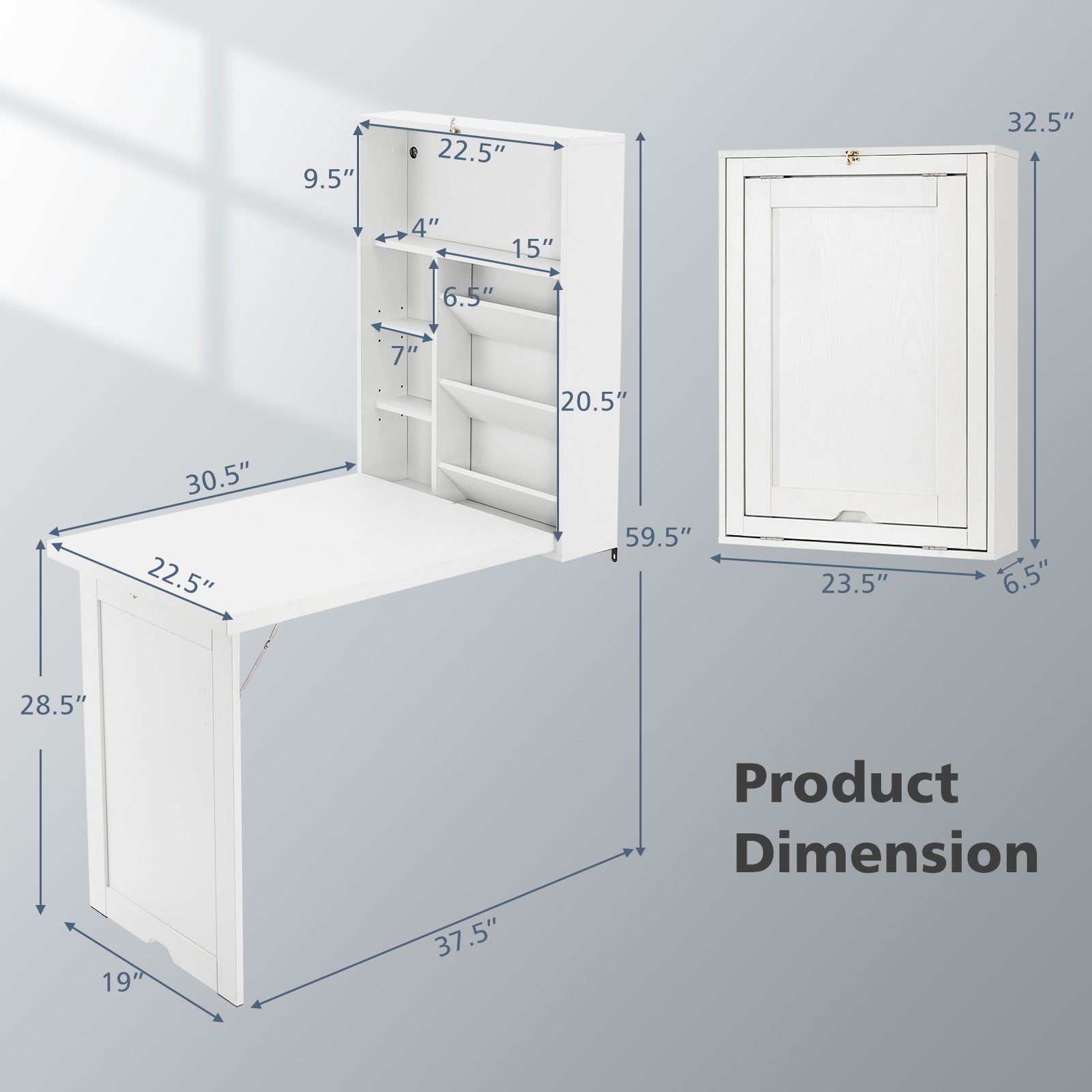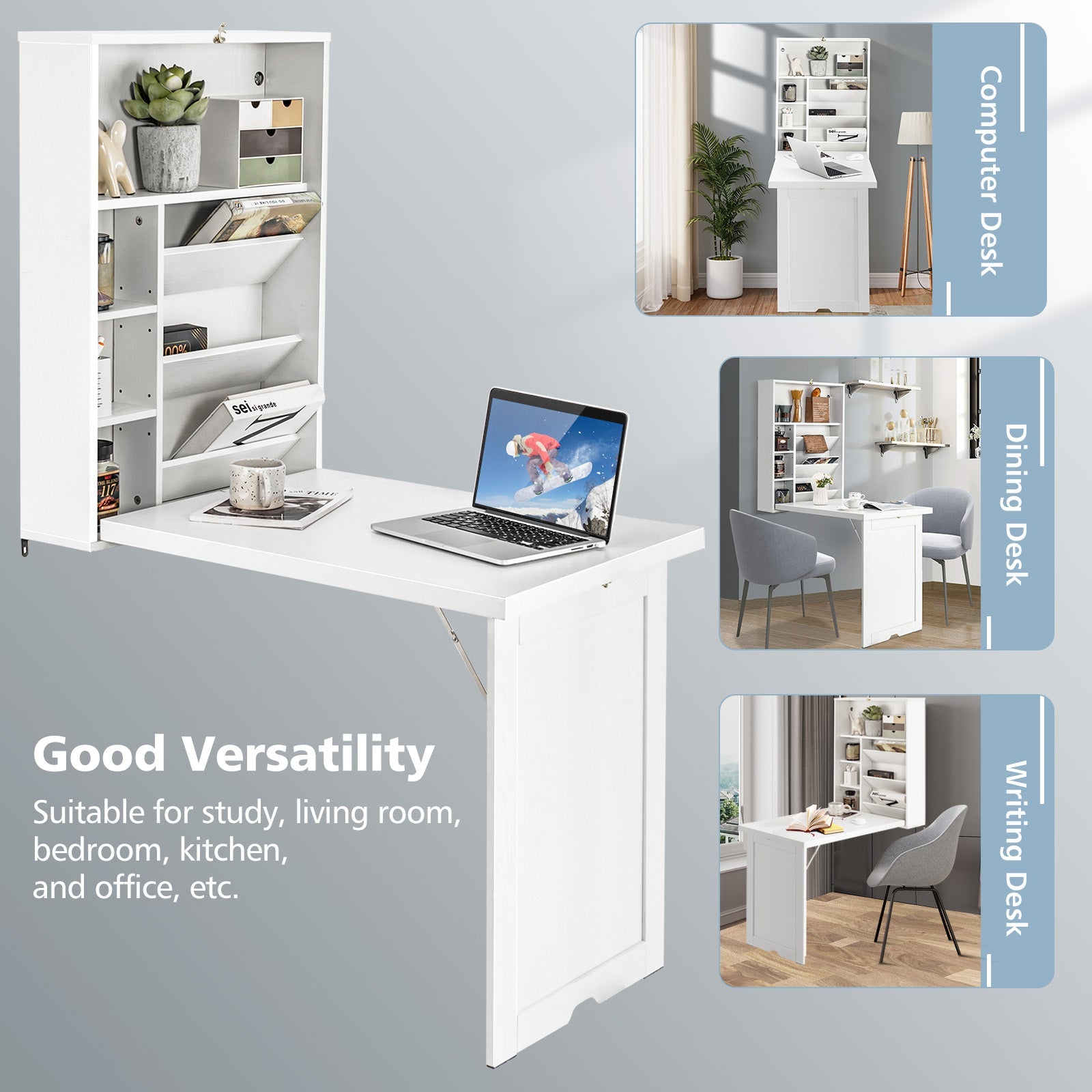 ● El diseño de montaje en pared ahorra mucho más espacio● Fácil de plegar y desplegar en minutos según los requisitos individuales● Construido con un tablero duradero, suave, delicado, resistente al desgaste e impermeable● Múltiples compartimentos y estantes ajustables para un amplio almacenamiento flexible● Almohadillas en las patas del gabinete para mayor estabilidad y protección del suelo● Diseño elegante y minimalista que combina a la perfección con cualquier decoración existente● Perfecto como estación de trabajo de oficina en casa, escritorio de estudio, mesa de comedorGuía de instalación