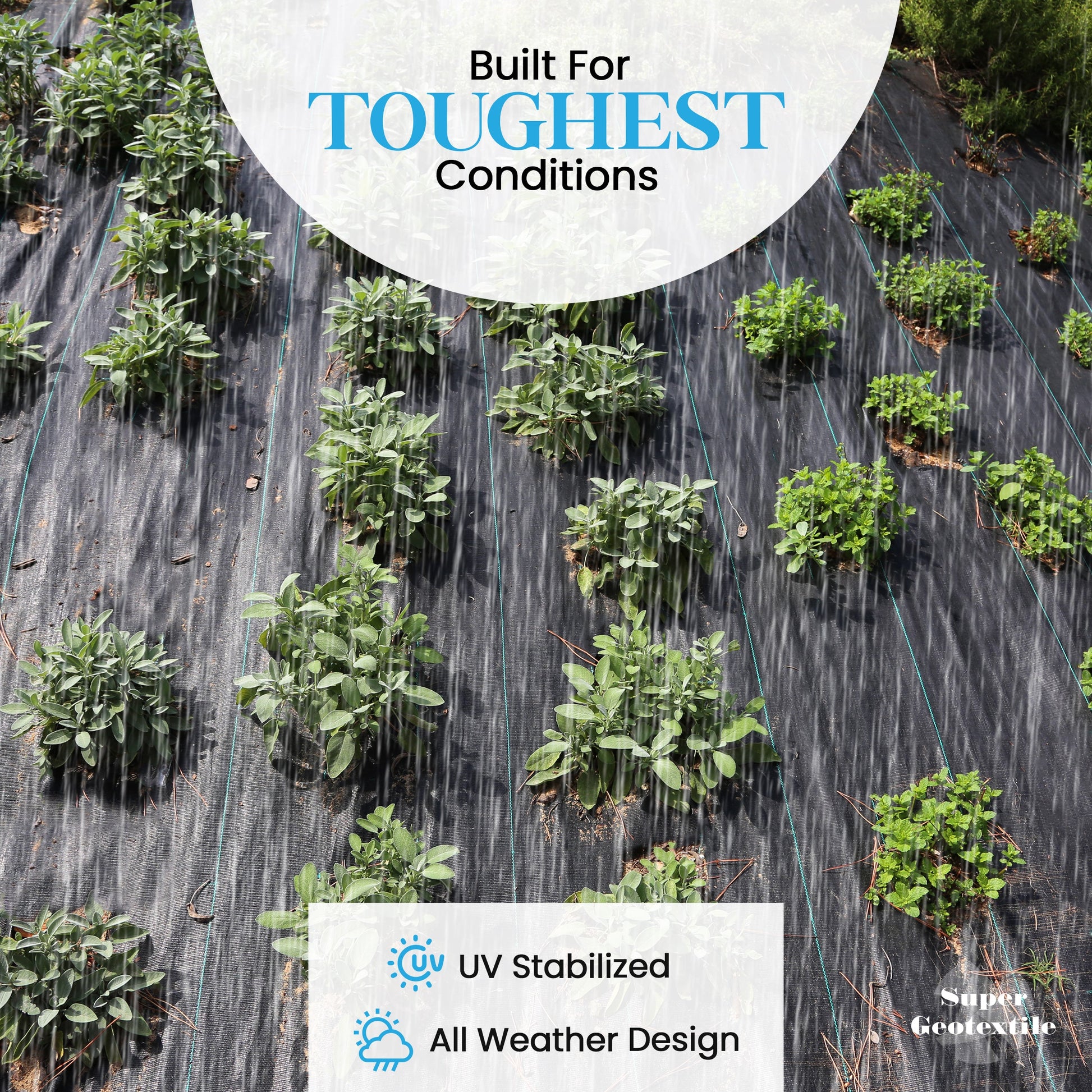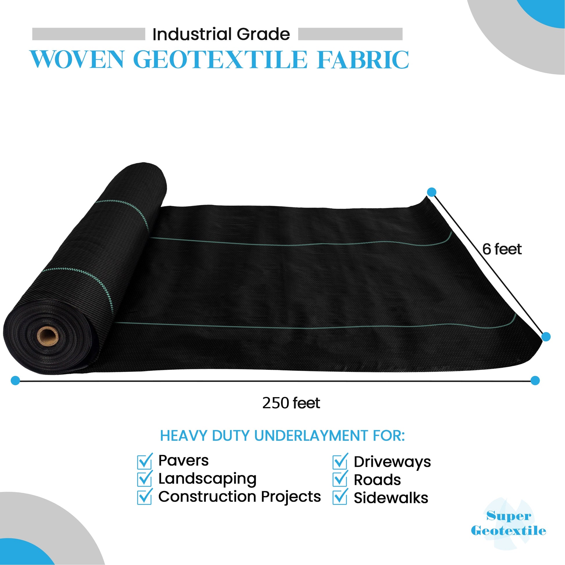 El geotextil tejido Super Geotextil es de grado comercial resistente y está hecho para durar 50 años. Este geotextil es un auténtico polipropileno tejido de 113 g (4 oz) y tiene una resistencia a la tracción de 90 kg (200 lb), lo que lo hace apto para el tránsito de automóviles y camiones.