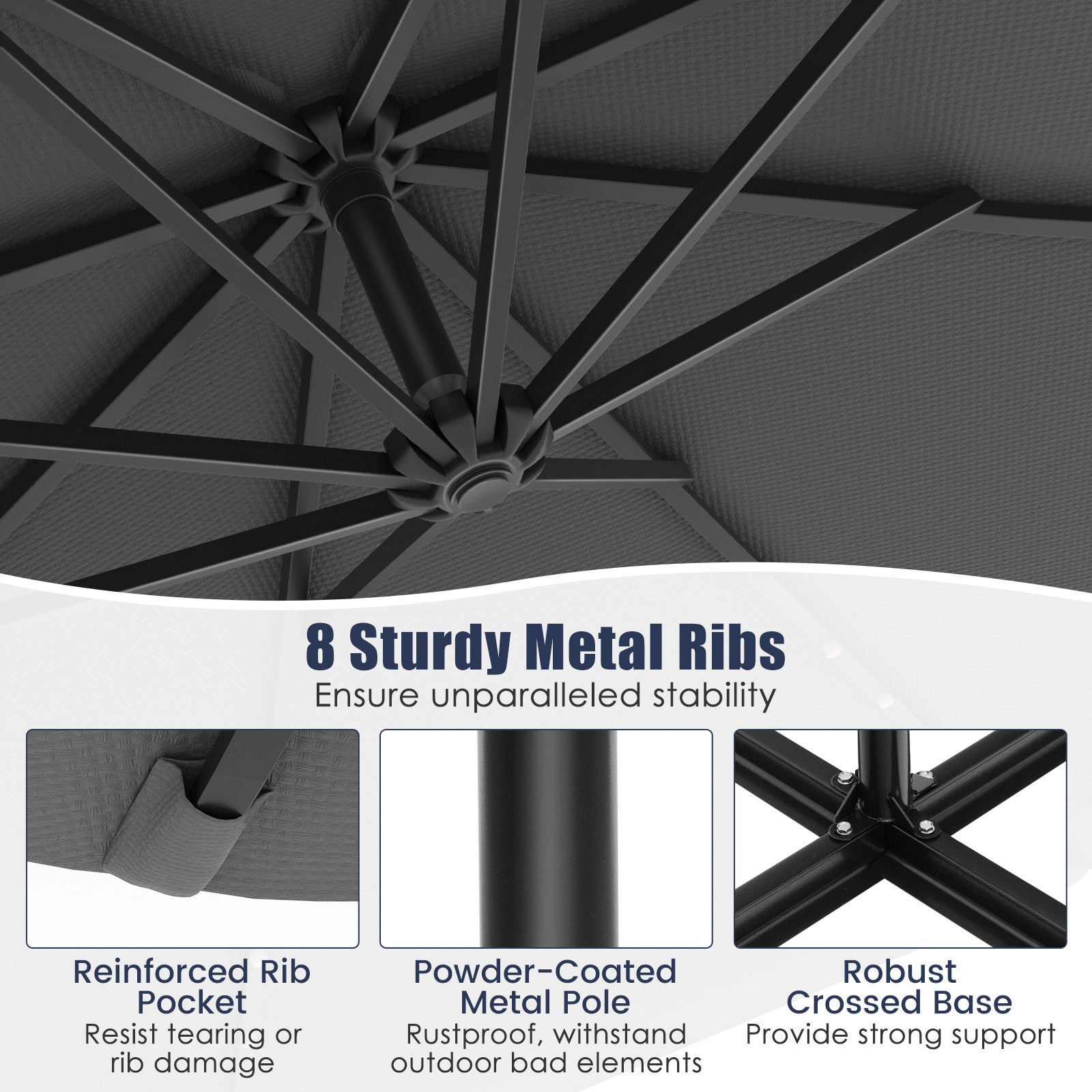 ● Comes with 40 lamp beads and each rib features 5 provide beautiful lighting● The solar panel provides illumination for up to 7 hours when fully charged● With its large shading area create a cool and comfortable outdoor retreat● The adjustable tilt function allows you to easily customize the shade angle from 0-35°● Easy to tilt: loosen the locking handle and then move the handle up and down● Made of high-quality polyester fabric fade-resistant wear and tear-resistant durable● Designed with a vented top for air circulation and stability even on windy days● Designed with a convenient crank handle for easy opening and closing● The loop strap provides a secure fastening option when the umbrella is not in use● 8 heavy-duty metal ribs ensure unparalleled stability and sturdiness● Features reinforced rib pockets help resist tearing or rib damage● The thick metal pole is rustproof and can withstand outdoor bad elements● Package includeing 1 Offset Umbrella 1 Cross Base 1 Instruction