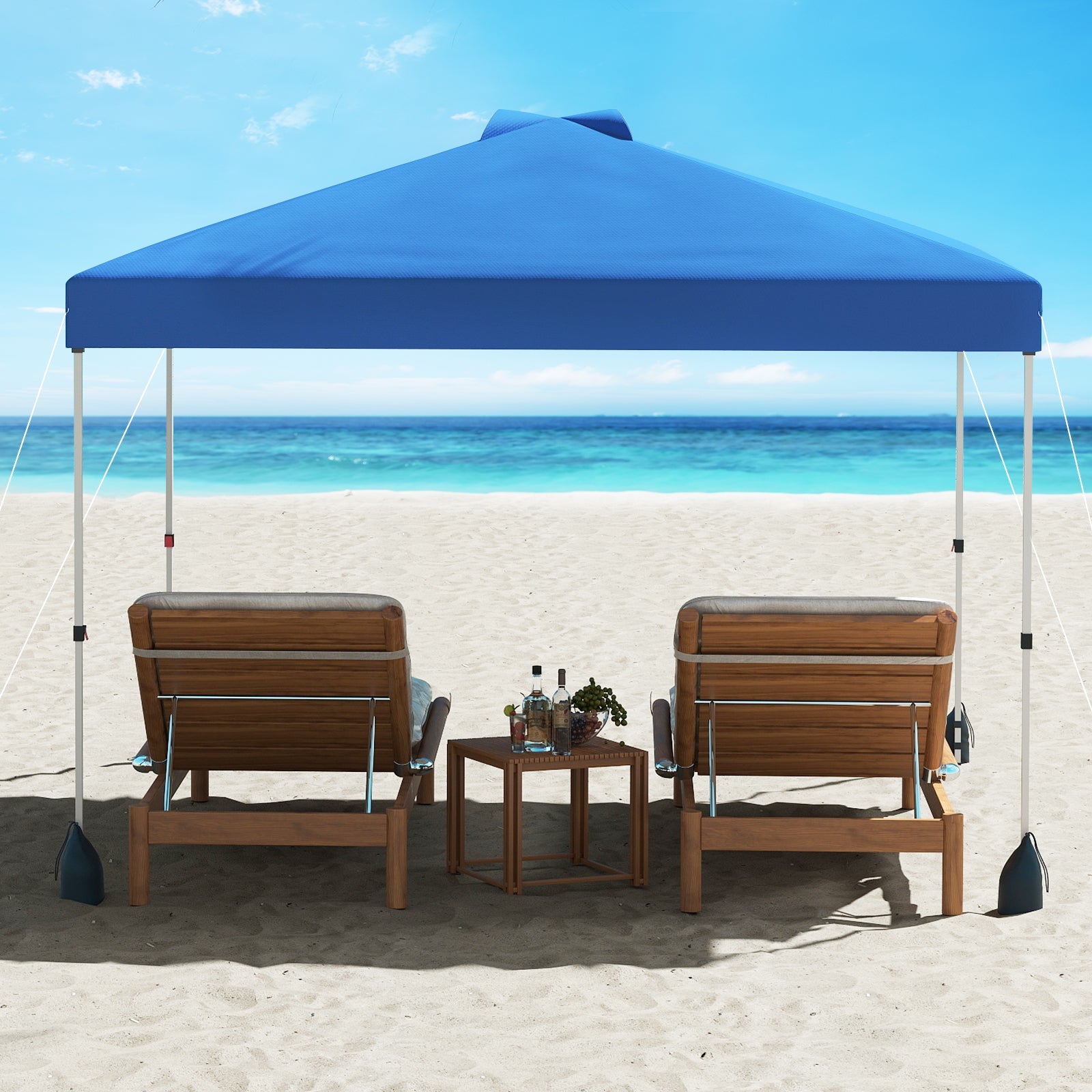 ● Equipped with a pop-up structure allow for easy setup no tools required● The convenient roller bag with 2 wheels makes it easy to store and transport● The wheeled bag features reinforced buckles for fixation and carrying handles● Equipped with stakes anchors wind ropes and sandbags to firmly secure the tent● Equipped with sturdy truss connections enhance strength prevent deforming● The pinch-free buttons allow you to securely lock the canopy frame in place● The oxford canopy ensures fade resistance drizzle resistance and tear resistance● The canopy with silver coating offers superior UPF50+ sun protection● Equipped with a sidewall for added sunshade easy to install and remove● The top air vent enhances ventilation and stability during windy conditions● STEP 1: Open the canopy frame● STEP 2: Fix the canopy top on the frame● STEP 3: Adjust the height as needed● STEP 4: Attach the sidewall