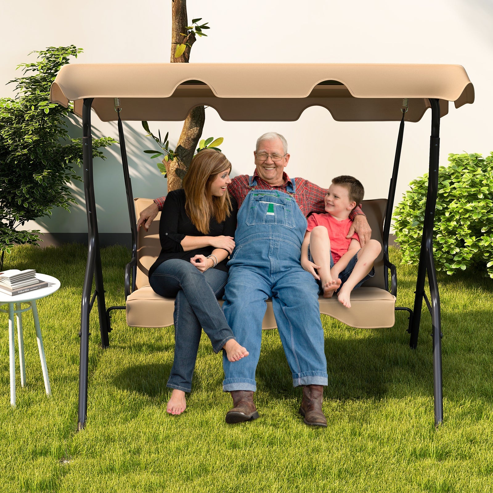 3 Seat Outdoor Patio Canopy Swing with Cushioned Steel Frame-Beige