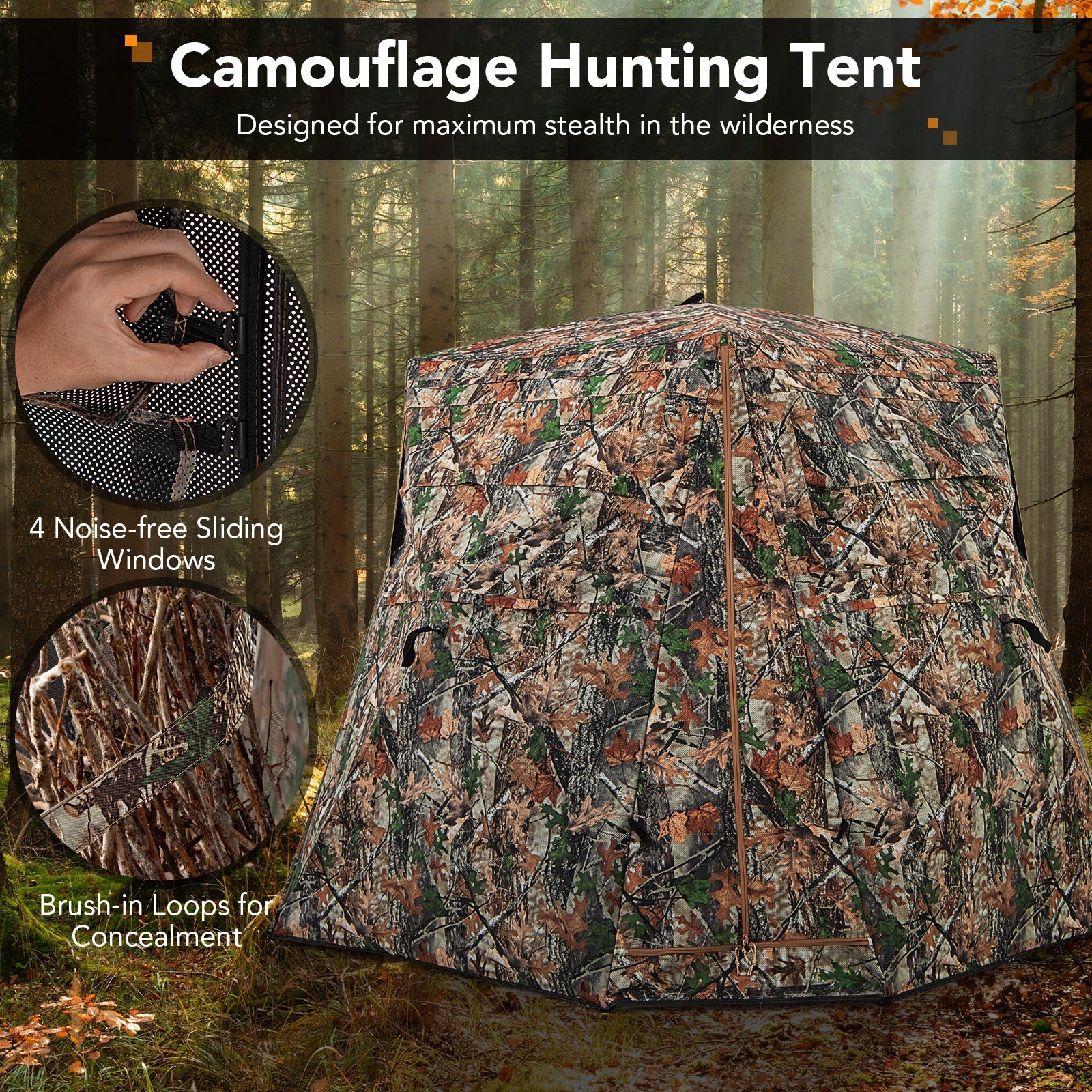 ● Boasts 4 full one-way see-through panels provide unparalleled 270 degree visibility● The camouflage patterns are designed for maximum stealth in the wilderness● 4 silent sliding windows provide the perfect vantage point for a successful hunt● Features brush-in loops for concealment add some branches to enhance camouflage● Easy to set up: pull the top rings and pull 4 side rings● Easy to take down: push all the rings fold and store it in the bag● Designed with a portable carrying bag make storage and transportation a breeze take it anywhere● Can be secured by sturdy stakes and wind ropes keep stable in windy conditions● The roof is made of 150D oxford fabric with PU coating provide good sun and rain protection● Supported by fiberglass poles and reinforced hub systems ensure good sturdiness ● Features 2 additional zippered sides with smooth double-sided zippers for easy access● 4 adjustable windows provide optimal coverage and shooting angles