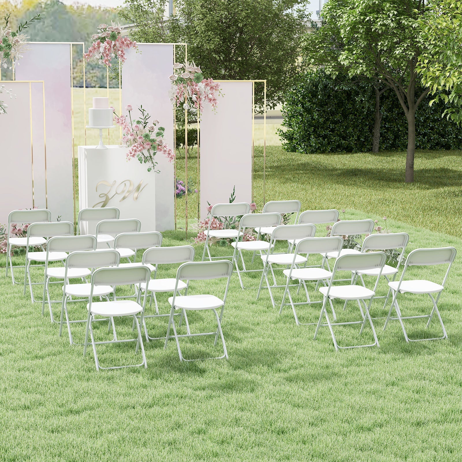 ● Suitable for home office weddings etc.● Robust metal frame for strong weight capacity● X-shaped structure and anti-slip footpads for higher stability● PP seat and back withstand extended outdoor use● Curved backrest makes you more relaxed● Simple-to-maintain surface saves your effort● Quick folding design for simple storage and carrying● No need to assemble just use the chairs directly