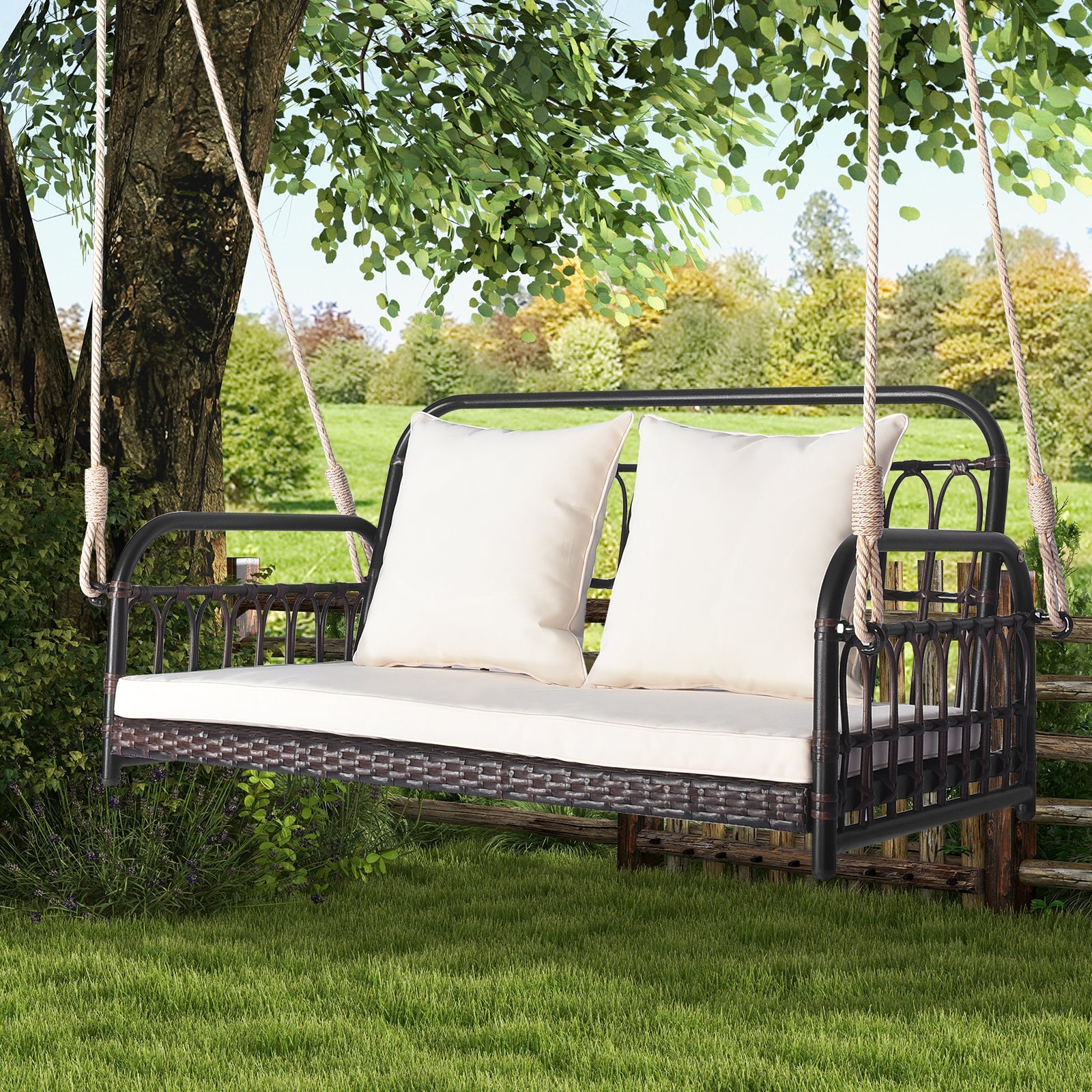 ● Colorfast hand-woven PE wicker for higher outdoor durability● Provide you with a comfy sitting experience with soft padded cushions● Removable and washable cushion cover for great convenience● Please always keep cushions dry for prolonged service time● 880 lbs strong bearing capacity for safe swinging● Seat up to 2 people for outdoor enjoyment ● 2 included hemp ropes for flexible hanging● Suitable for front porch garden backyard and more● Convenient to assemble