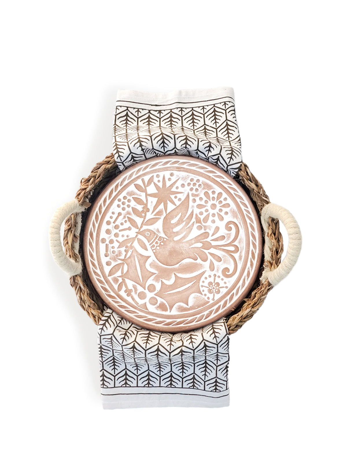 Ajoutez une touche d'inspiration artisanale à votre cuisine avec un chauffe-pain en terre cuite et un torchon sérigraphié à la main. Gravé d'un motif d'oiseau et découpé pour s'insérer parfaitement dans un panier rond, ce chauffe-pain spécial en terre cuite est naturellement isolant. Le panier lui-même est tressé à la main à partir d'algues marines cultivées durablement. Le torchon est idéal pour essuyer la vaisselle ou les mains en cuisine, en garnissant une corbeille à pain. Un cadeau idéal pour tous les amateurs de pain !
