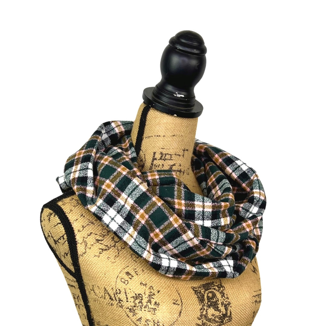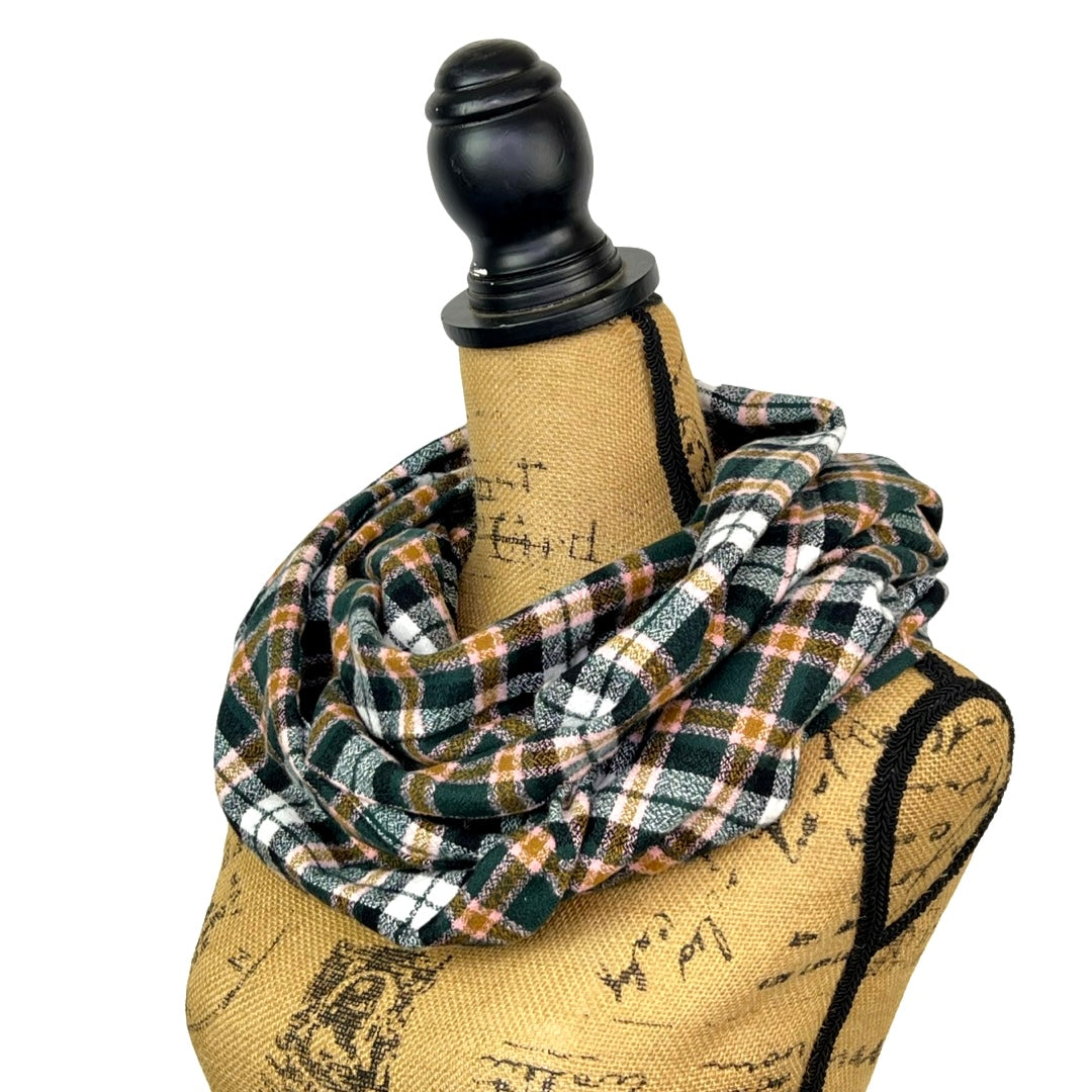 Écharpe infinie ou couverture en flanelle à carreaux vert forêt foncé, noir, blanc, caramel et rose pâle