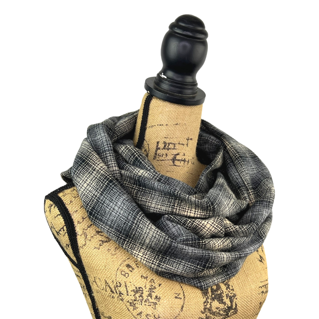 Enveloppez-vous de chaleur et de style avec cette écharpe infinie ou écharpe-couverture en flanelle à carreaux. Douce et confortable, cette écharpe est confectionnée en flanelle à carreaux ombrée alternant gris fumé clair, beige sable et noir. Elle vous gardera au chaud et élégante toute la saison !