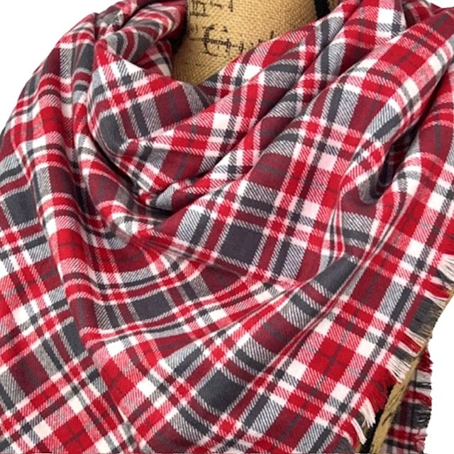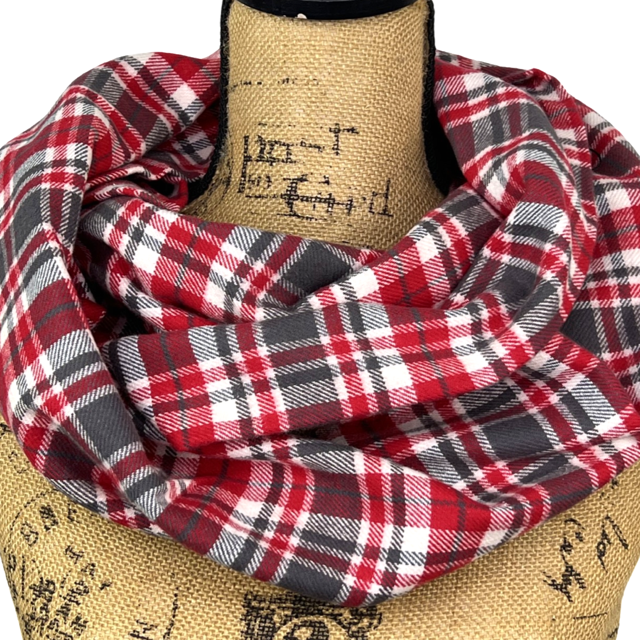 Écharpe infinie ou couverture en flanelle à carreaux rouges, gris anthracite et blancs