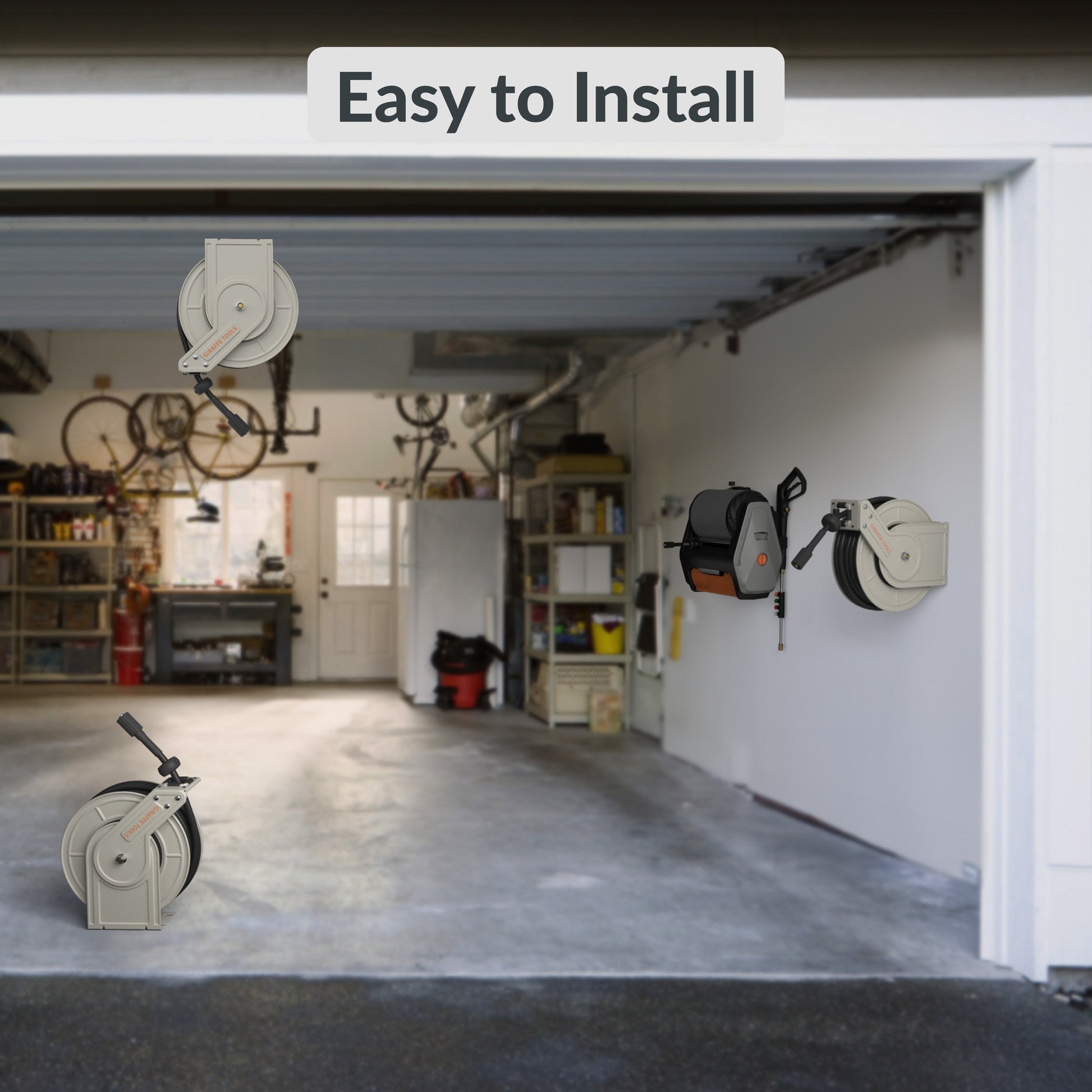 Enrouleur de tuyau de pression rétractable Giraffe Tools équipé d'un mécanisme de verrouillage, le tuyau peut être ajusté à n'importe quelle longueur requise et est résistant à l'huile et à l'abrasion, plage de température de -40 à 150 ℉, ce qui le rend adapté à une utilisation toute l'année.