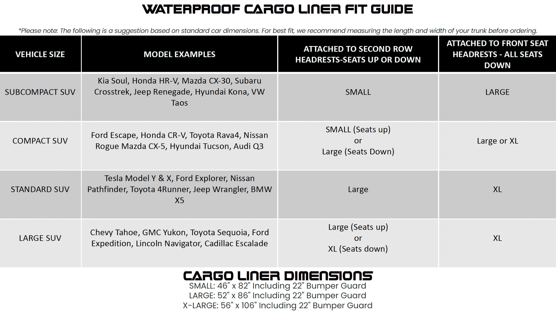 - TROIS TAILLES - Petit : 46" x 82" ; Grand : 52" x 86" ; XL : 56" x 106" (incluant le rabat de pare-chocs de 22"). Veuillez mesurer pour assurer un ajustement parfait.