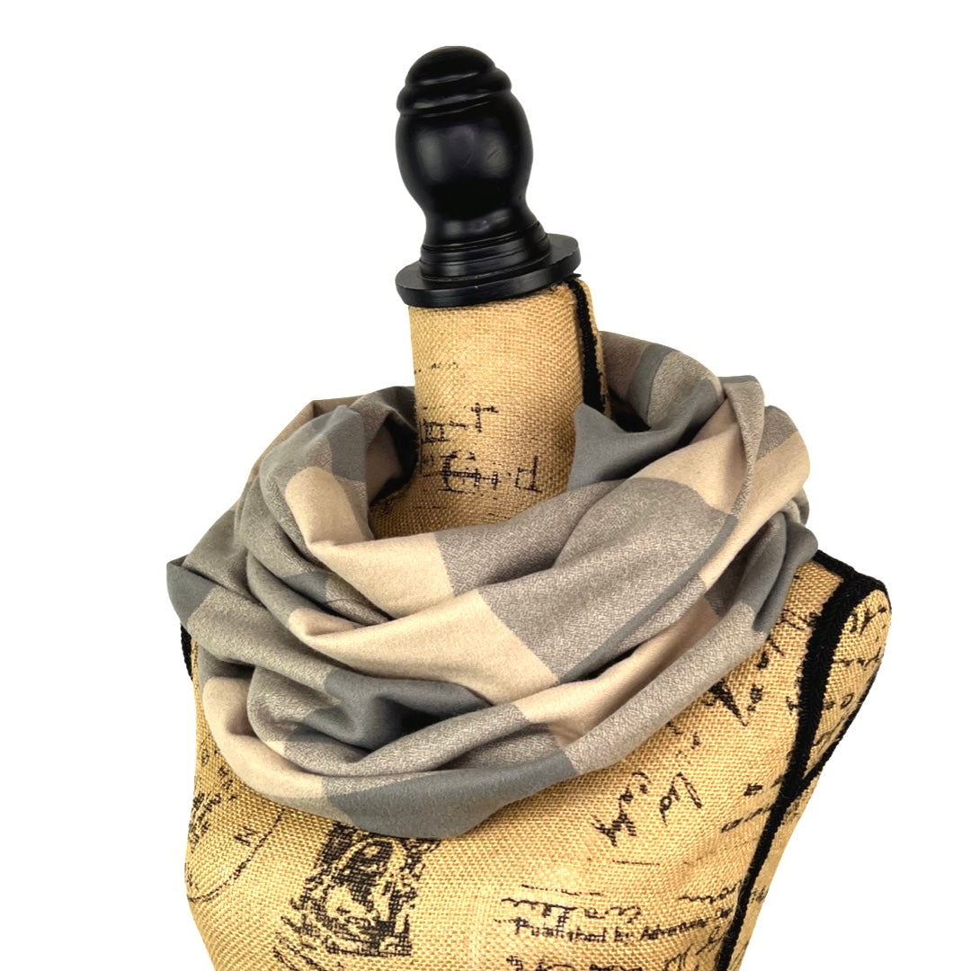 100% Organic Cotton Buffalo Plaid Large Block in Latte and Warm Smoky Grey Infinity and Blanket Scarves