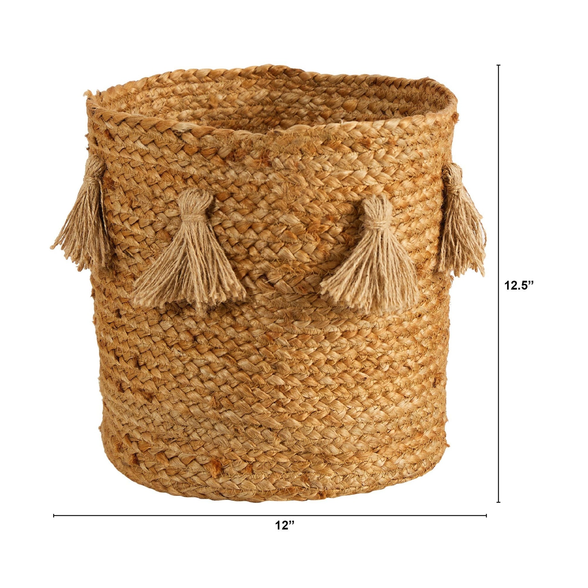 12.5” Boho Chic Natural Hand-Woven Jute Basket with Tassels