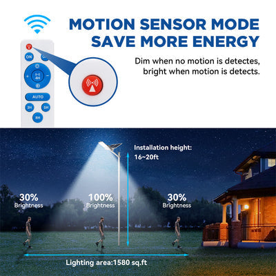 30,000LM daylight white output (6500K) equivalent to 1200W traditional lighting, 3-4 times brighter than standard solar lights with uniform light distribution without dark spots.