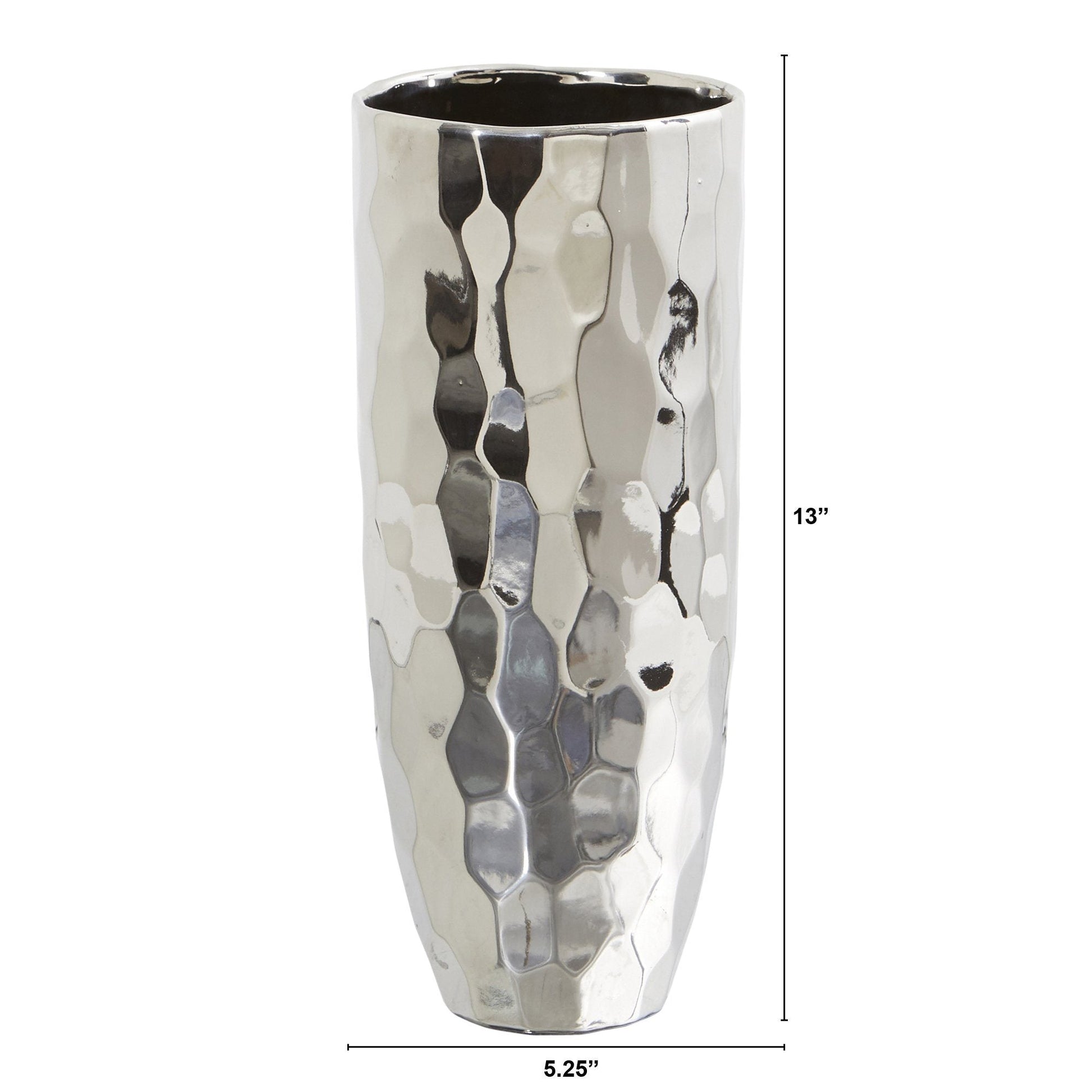 Add some glam to your space with this Designer Silver Cylinder Vase. If you want to bring attention to your greenery, look no further. Texture, color, and glare all in one. Perfect for Hollywood glam, modern, and many other décor styles. Standing 13", this tall cylinder vase will attract attention wherever displayed. House hydrangeas, roses or other flowers.