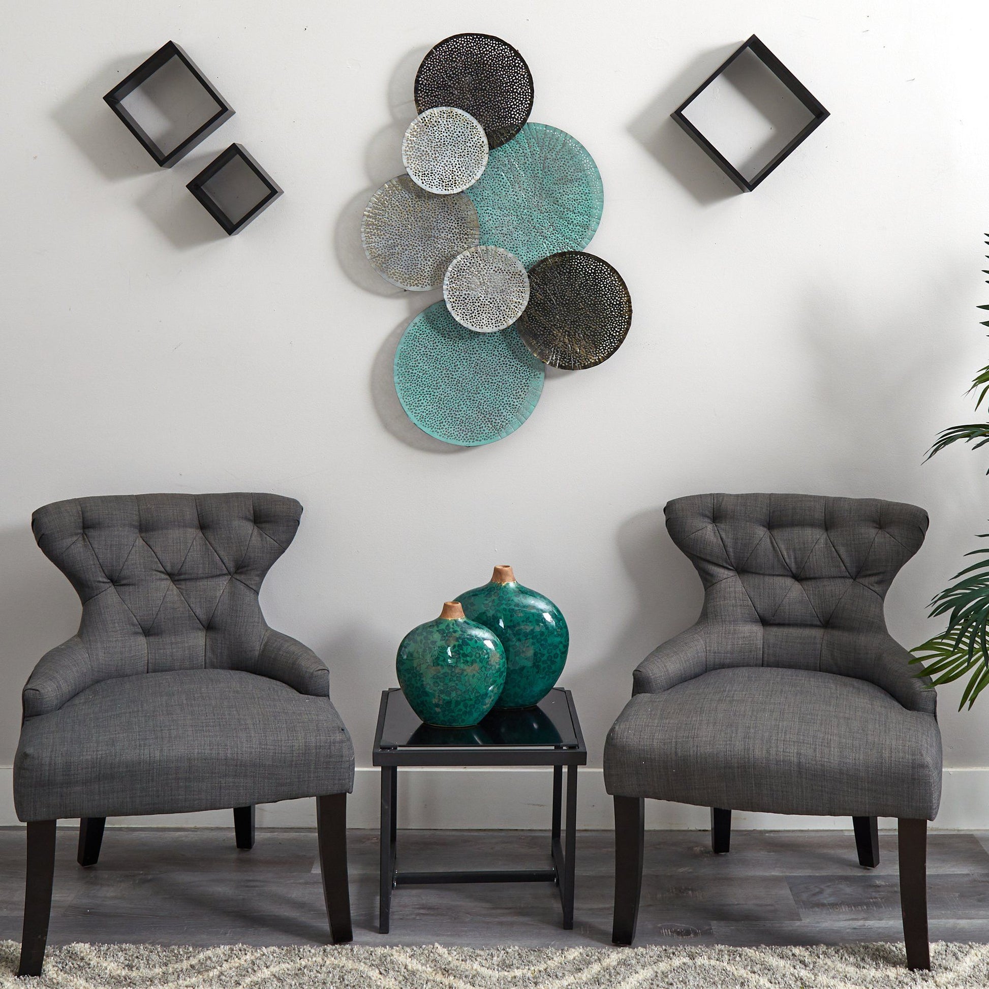 Add visual interest to your living areas with this Metal Wall Art Décor. Different shaped bubbles in soft colors form a cluster similar to clouds. If you look closely at the plates' center, you'll see dark little dots adding a rustic touch that contrasts the lighter colors. With dimensions of 2.5' X 1', hang in any bare wall that needs some sprucing. Perfect for a living room, bedroom, guest room, or foyer next to a table.