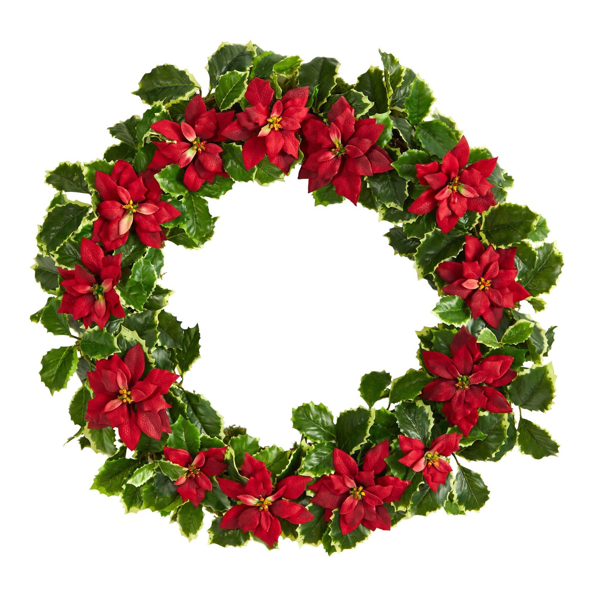 Put your Christmas cheer on full display with this Poinsettia and Variegated Holly Artificial Christmas Wreath. Crafted from high-quality materials and inspired by nature, lifelike red Poinsettia sit on a bed of green holly leaves, delivering classical Christmas cheer. The variegated holly adds a fun mix of Christmas colors, allowing you to hang in any space. With a diameter of 21", this wreath is perfect for the holidays. Makes a fine gift too