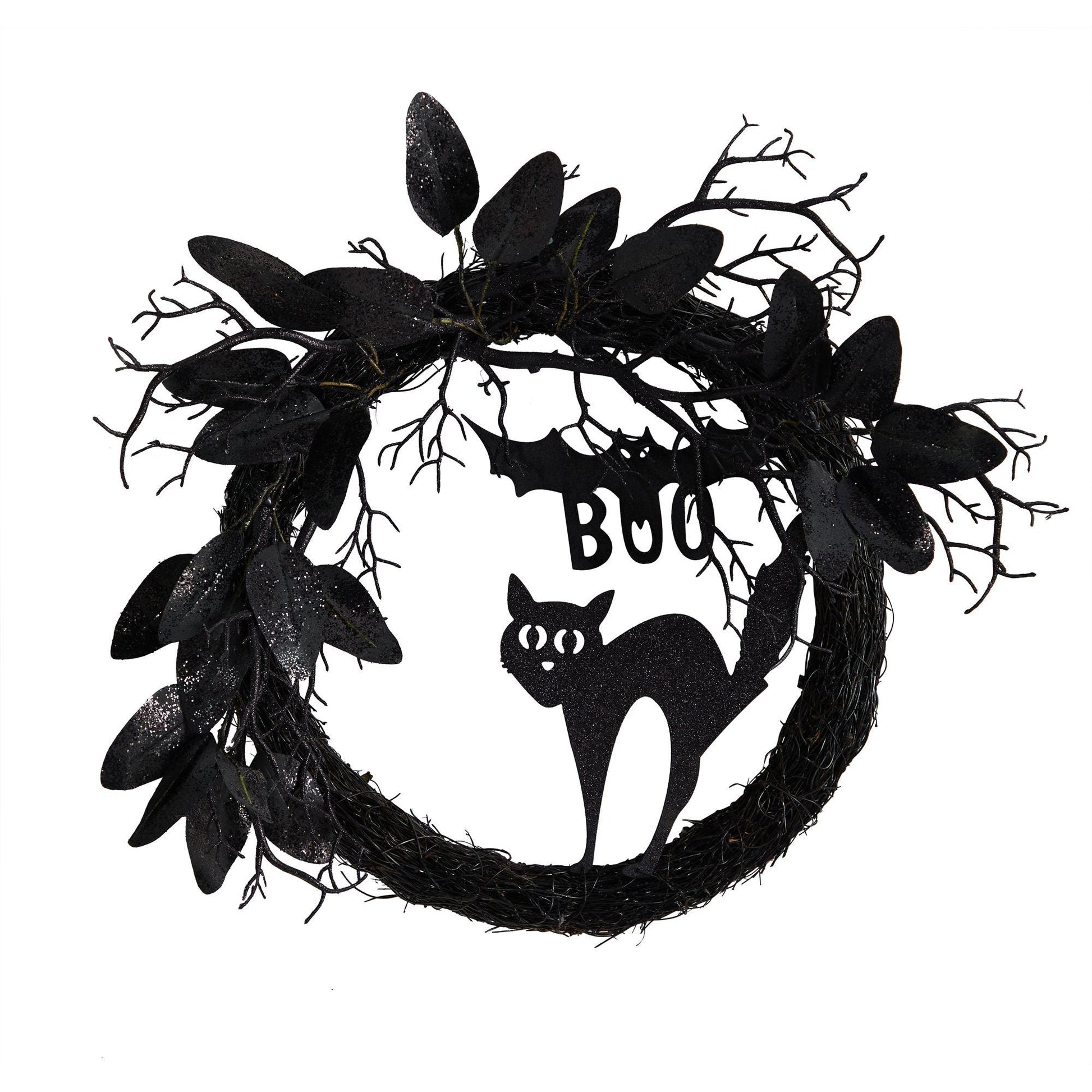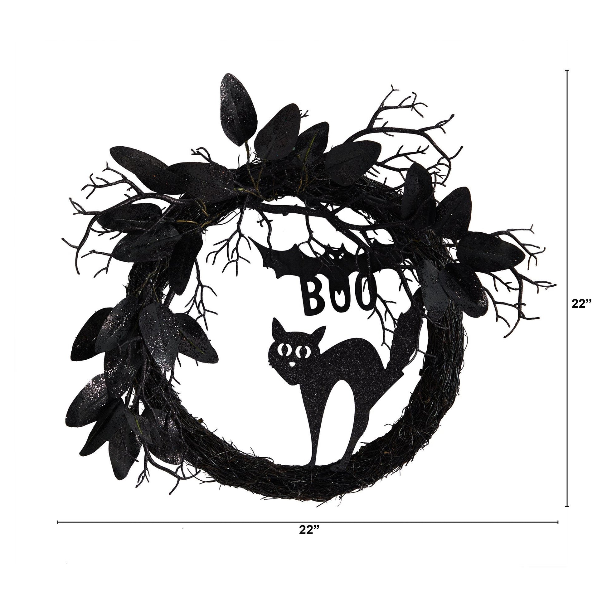 22” Halloween Black Cat and Bat Boo Twig Wreath