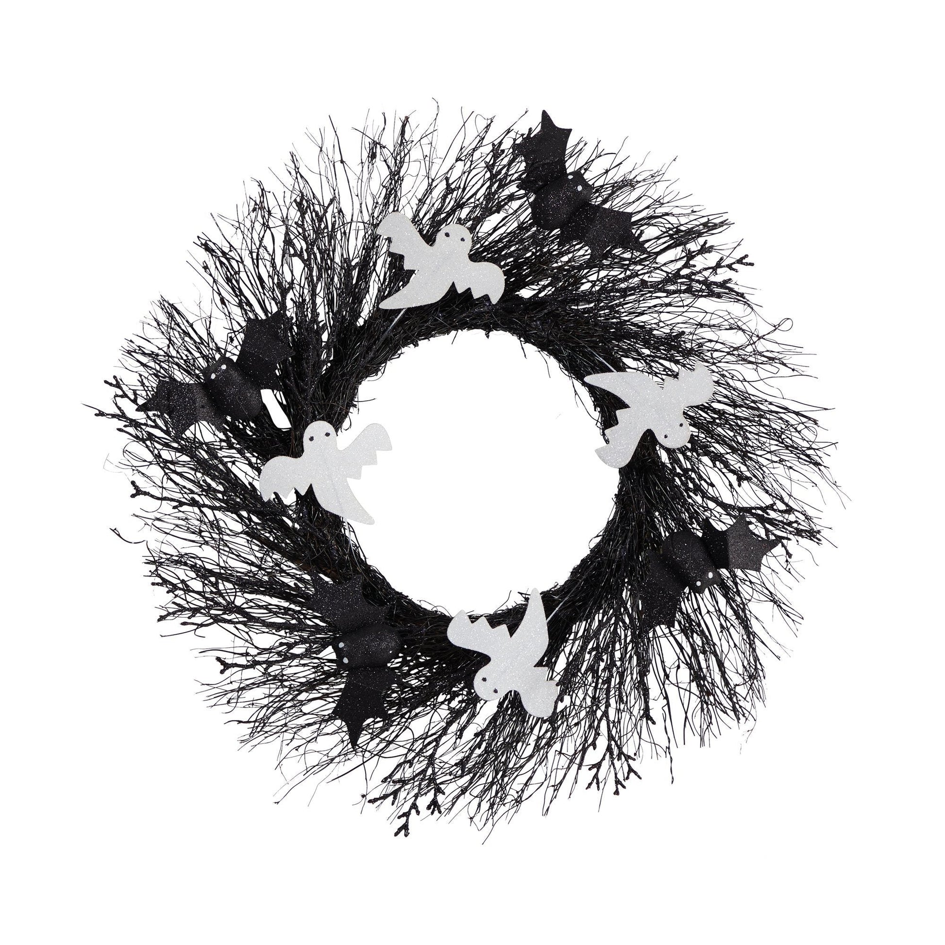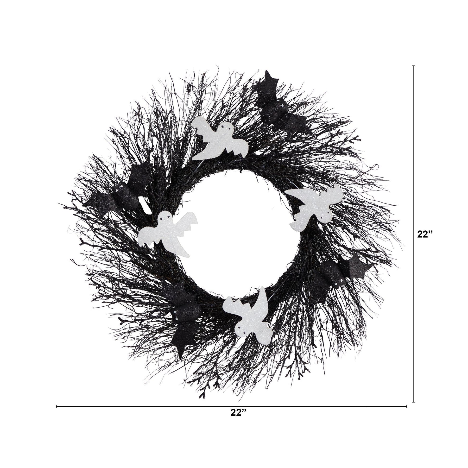 Create your own mini haunted house with this Spooky Bats and Ghosts Halloween Wreath. Black twigs are accented by white and black spooky bats adding a scary touch. Stand out this Halloween season by hanging in any space in need of a festive touch. With a diameter of 22' house in any door or bare wall. Makes a fine gift too.