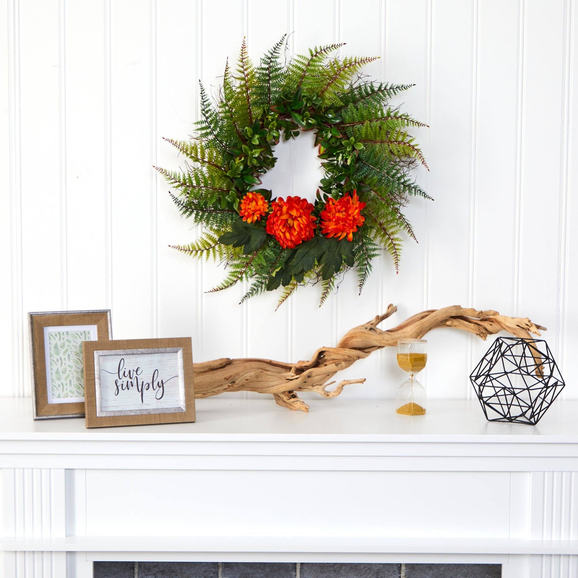 Update your traditional decor accents and add some curb appeal to your home or office entrance with the beauty provided by this artificial wreath intricately designed with a mix of realistic looking fern foliage, beautifully complemented with delicate silk chrysanthemum blossoms in a fresh palette of natural hues. Great for year-round display, this 23” (in circumference) faux wreath makes for an inviting accent and will undoubtedly transform any home’s front-door appeal.