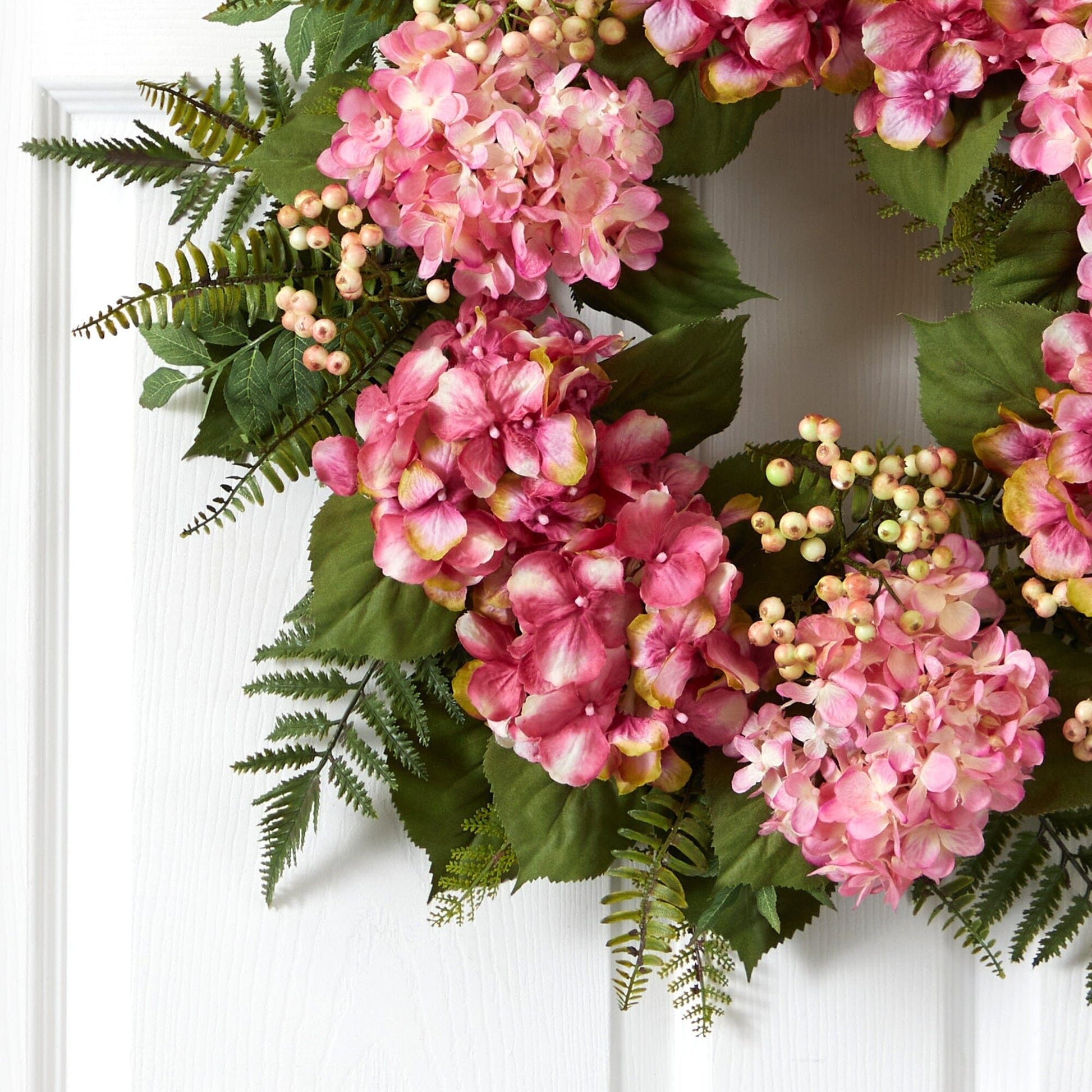 Let the splendor of the outdoors come into your home with this stunning 24” artificial hydrangea and berry wreath. For a softer feel to your bedroom or front door, add this ornament with its beautiful pink blooms that give off a playful and charming appeal.