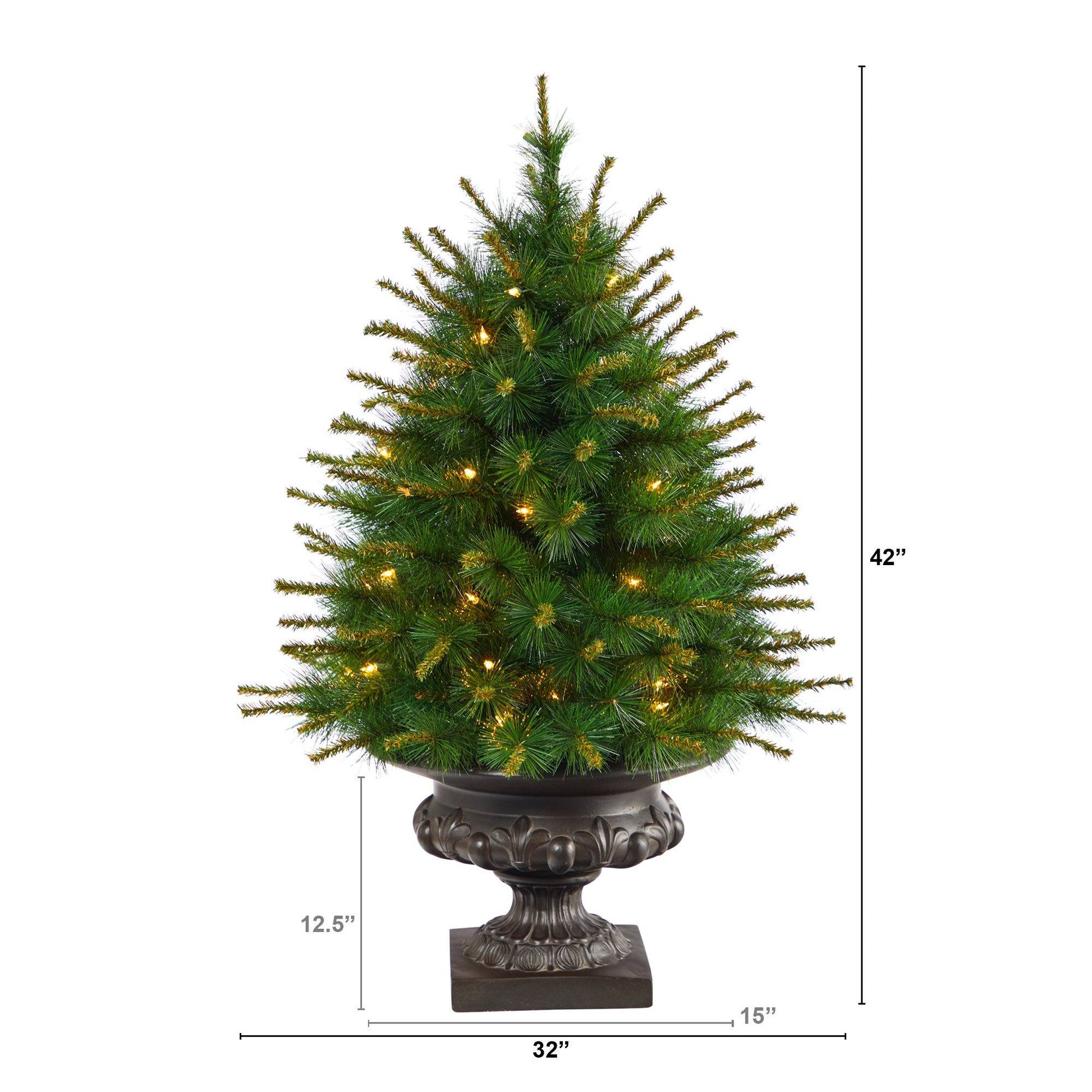 Bring the charm of the Northeast with this New England Pine Artificial Christmas Tree. A robust silhouette – that mimics the foliage and texture of real evergreens – with 117 easy-to-bend branches, some even have variegated tips – house your favorite holiday mini ornaments and shape to fit your space. Arriving pre-strung with 50 clear lights, this tree requires zero maintenance nor setup, it comes ready to decorate. Standing 3.5’ and stabilized in an iron colored urn (included in height), curate in compact spaces that need some holiday cheer. Perfect for kids’ rooms, lonely corners, or apartments.