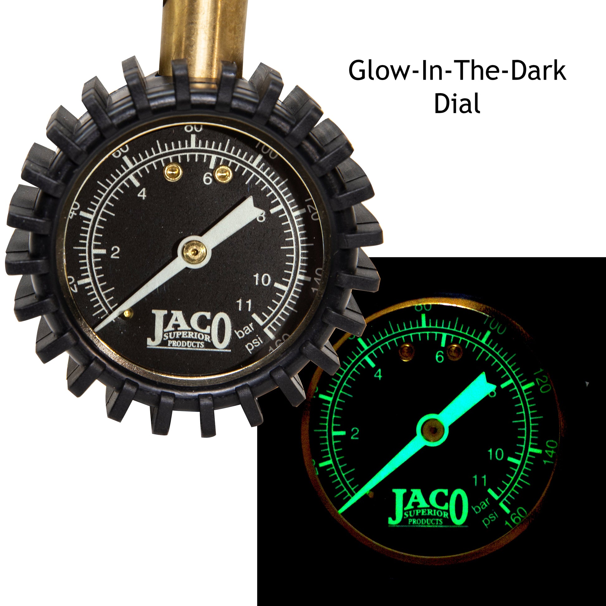 • Larger, 2" glow-in-dark dial features easy-to-read dual measurement scale 0-160 PSI / 0-7 BAR, providing accurate readings that "lock" in place until the pressure reset button on the neck is pushed