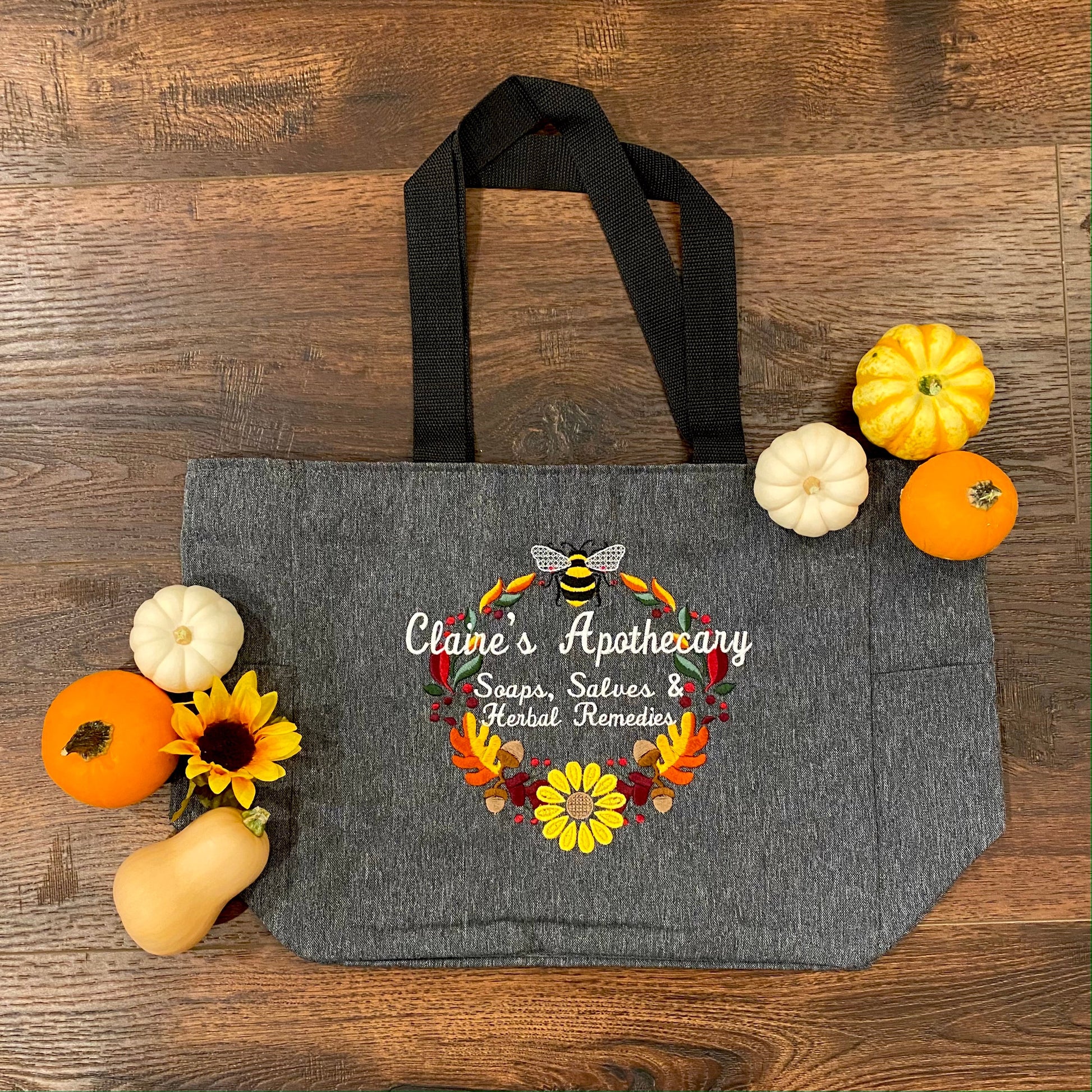 "Claire's Apothecary, Soaps, Salves, & Herbal Remedies" Embroidered Fall Wreath Tote Bags