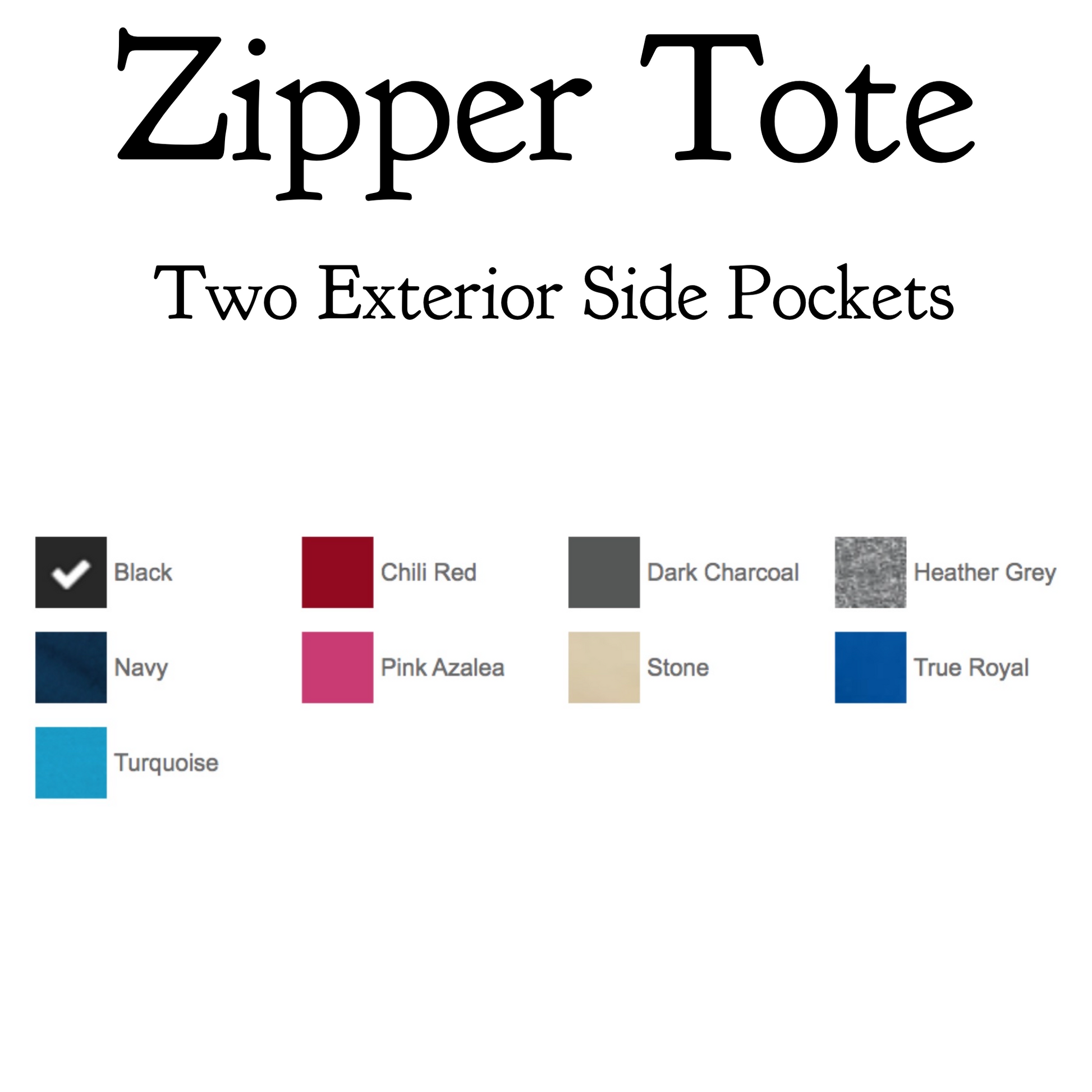 Available in a Zipper Top Style with two exterior pockets and a full zip closure, and an Open Top style with an interior pocket and one exterior pocket (colors subject to availability). Multiple tote bag colors available - see photos for color options. Feel free to leave tote bag and embroidery thread color requests in the notes of your order.