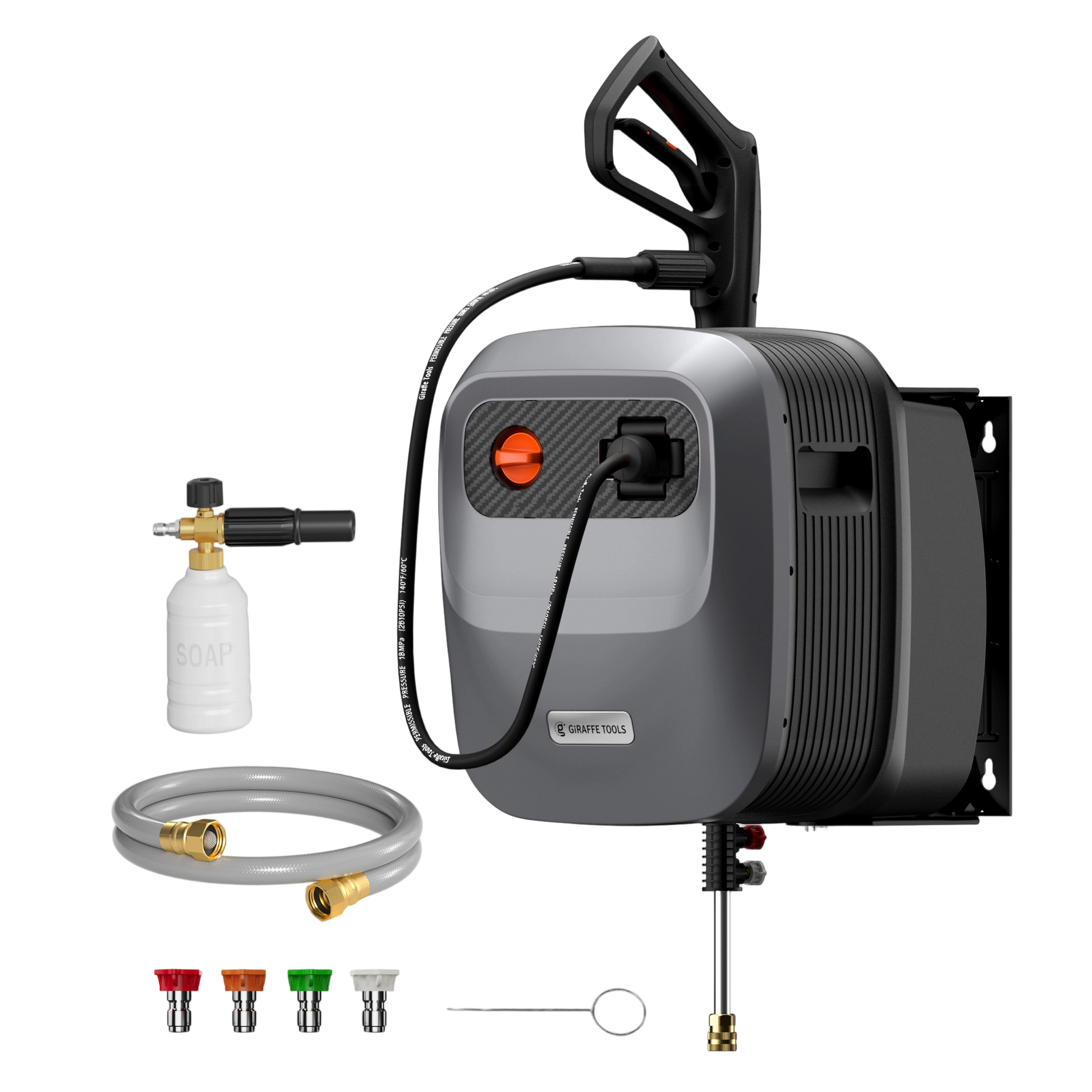 Giraffe G20 Pressure Washer is the newest innovation in our Grandfalls Pressure Washerline line. The All-in-one units with a unique rotating wall mounted pressure washer design and auto-retract system provide a one-stop cleaning service, making cleanliness and tidiness effortless. No need to think about assembly, just pull out the hose for every use and say goodbye to tedious cleaning.