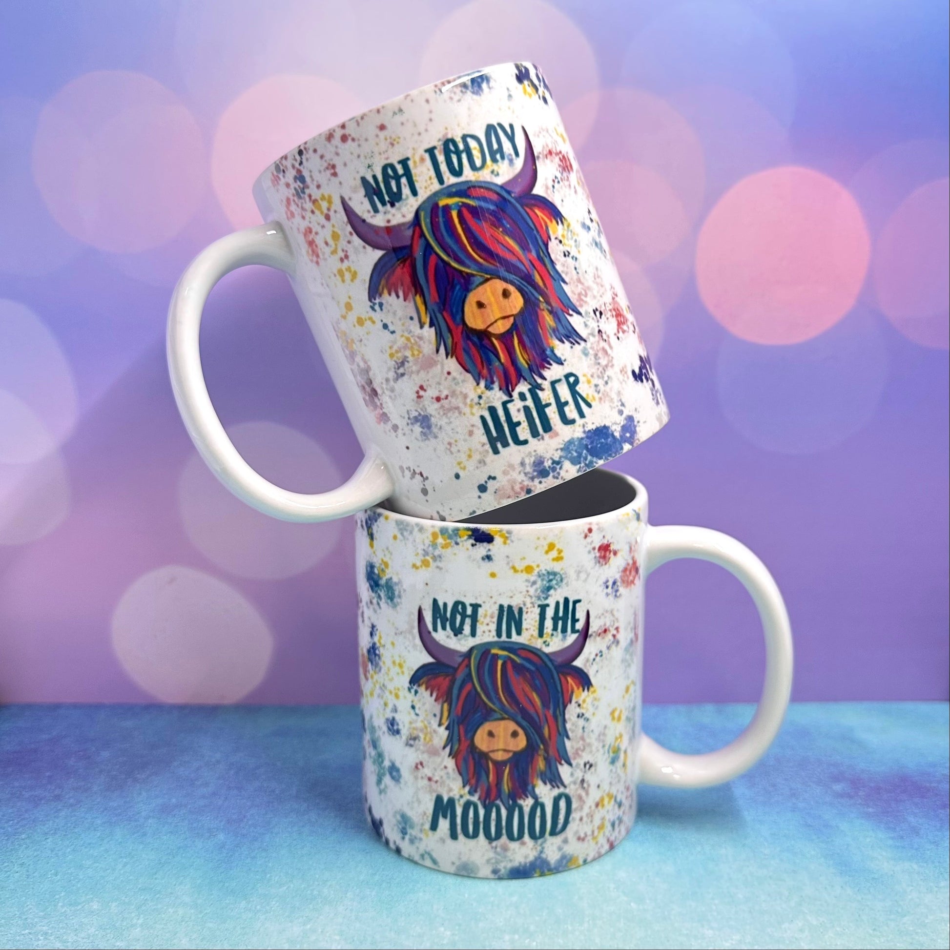 It's been so fun creating these new designs and I can't help but put them on everything! Original artwork by Thistle & Stitch - "Not Today Heifer" and "Not in the Mooood" Cute Highland Coo, Hairy Cow 11oz Ceramic Coffee Mug.