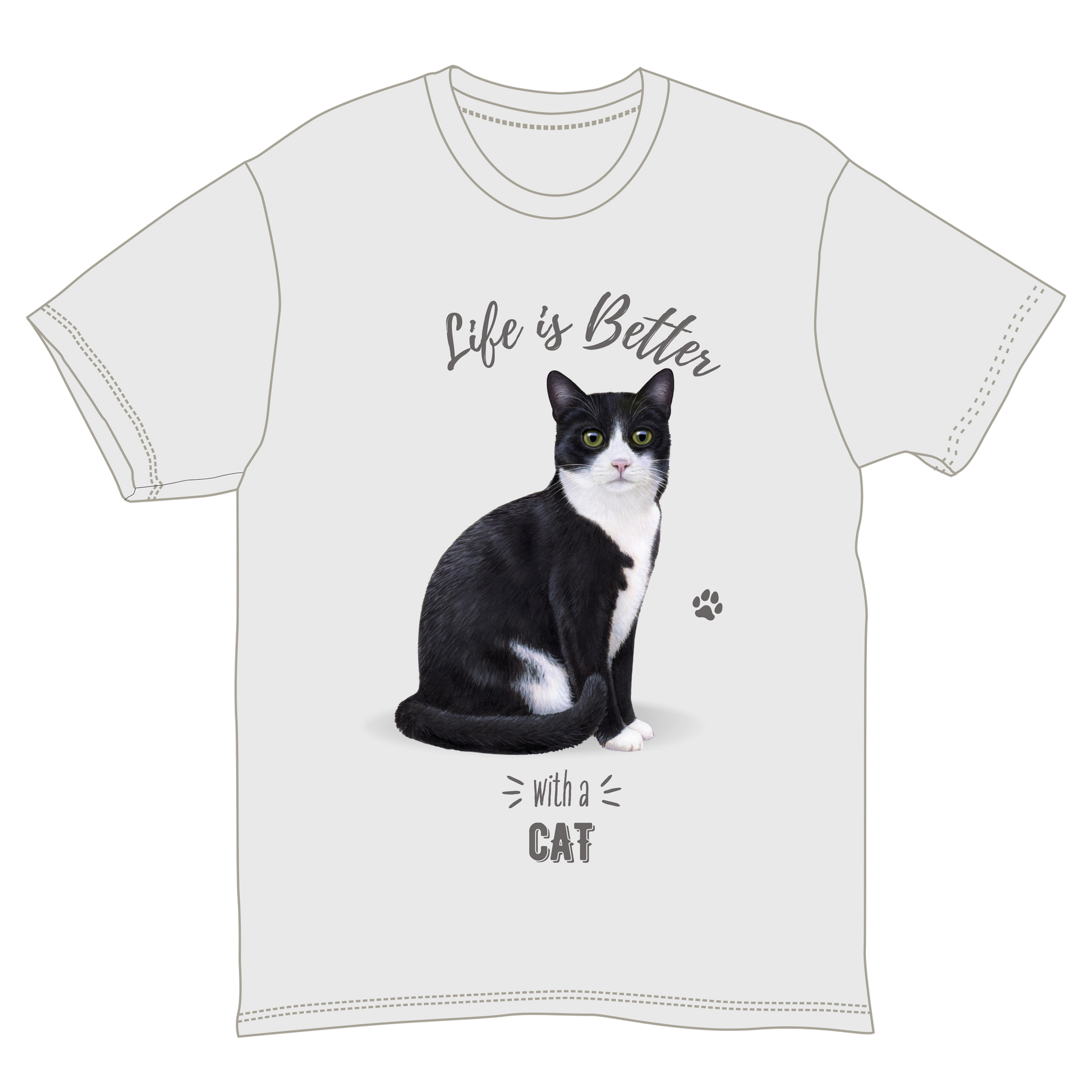 This delightful t-shirt, crafted from 100% soft cotton, features an adorable illustration of a cat alongside the phrase "Life is Better with a CAT." Its classic white color and unisex design provide a versatile and comfortable fit, perfect for casual outings or relaxing at home.