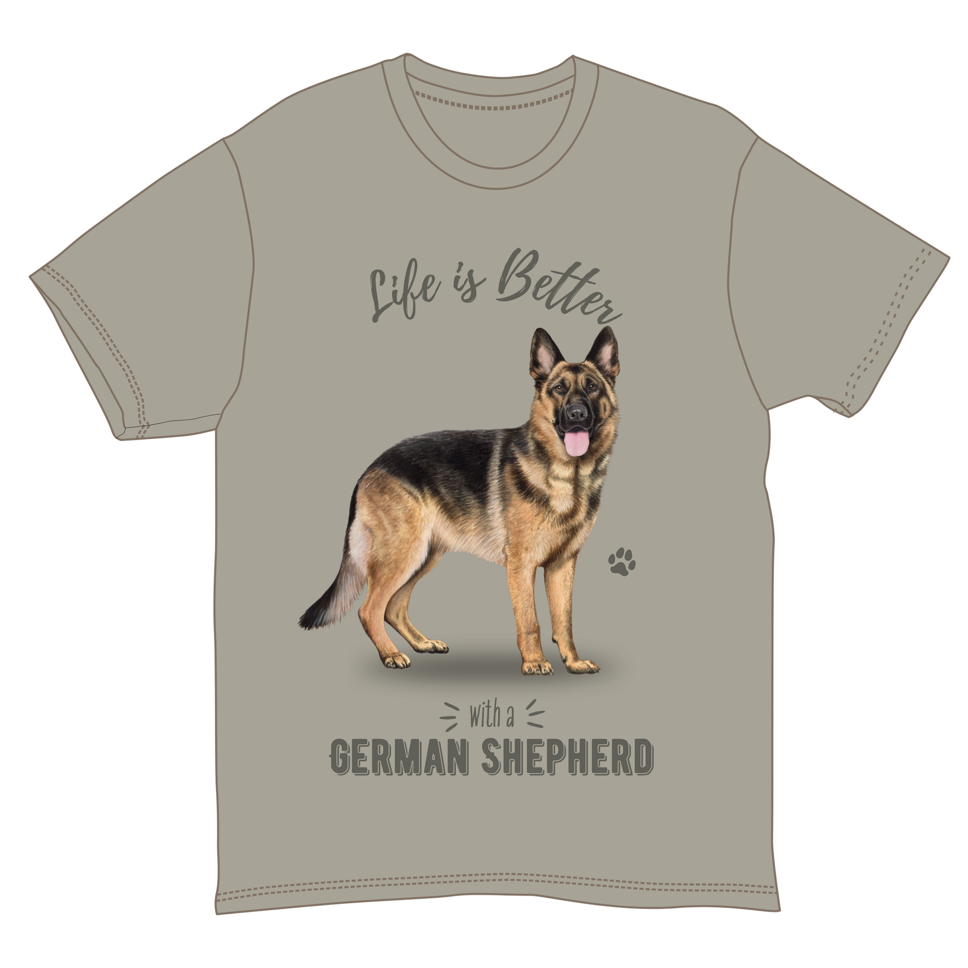 This stylish t-shirt, made from 100% soft cotton, features a striking illustration of a German Shepherd alongside the phrase "Life is Better with a GERMAN SHEPHERD." Its versatile beige color and unisex design make it a comfortable choice for anyone, suitable for both casual outings and cozy days at home.