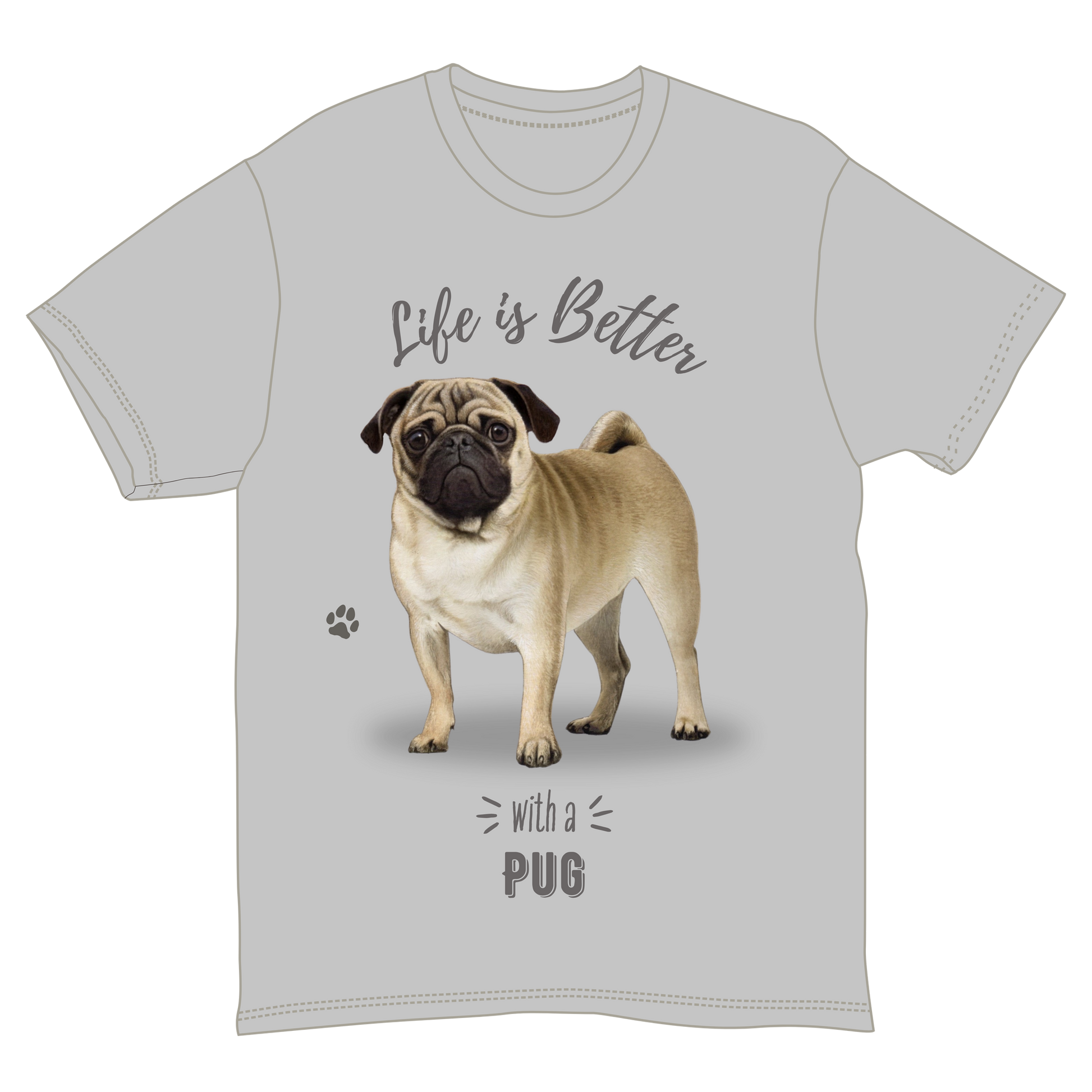 This adorable t-shirt, made from 100% soft cotton, features a charming illustration of a pug along with the phrase "Life is Better with a PUG." In a stylish light gray color and unisex design, it offers comfort and versatility, making it perfect for casual outings or relaxed days at home.