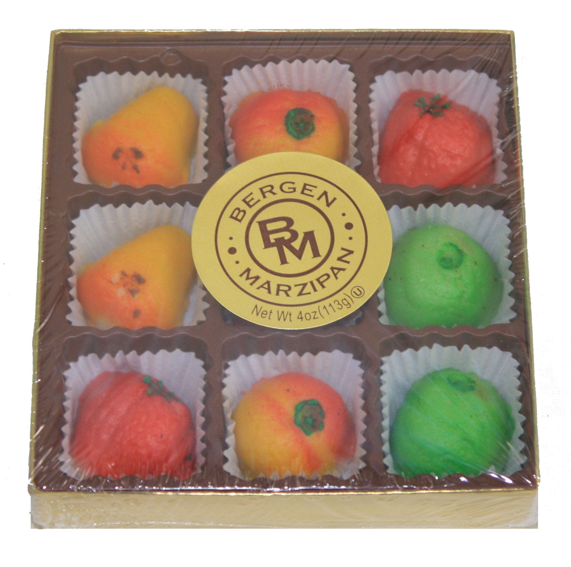 - 4 oz box with 9 randomly assorted fruit-shaped marzipan pieces
