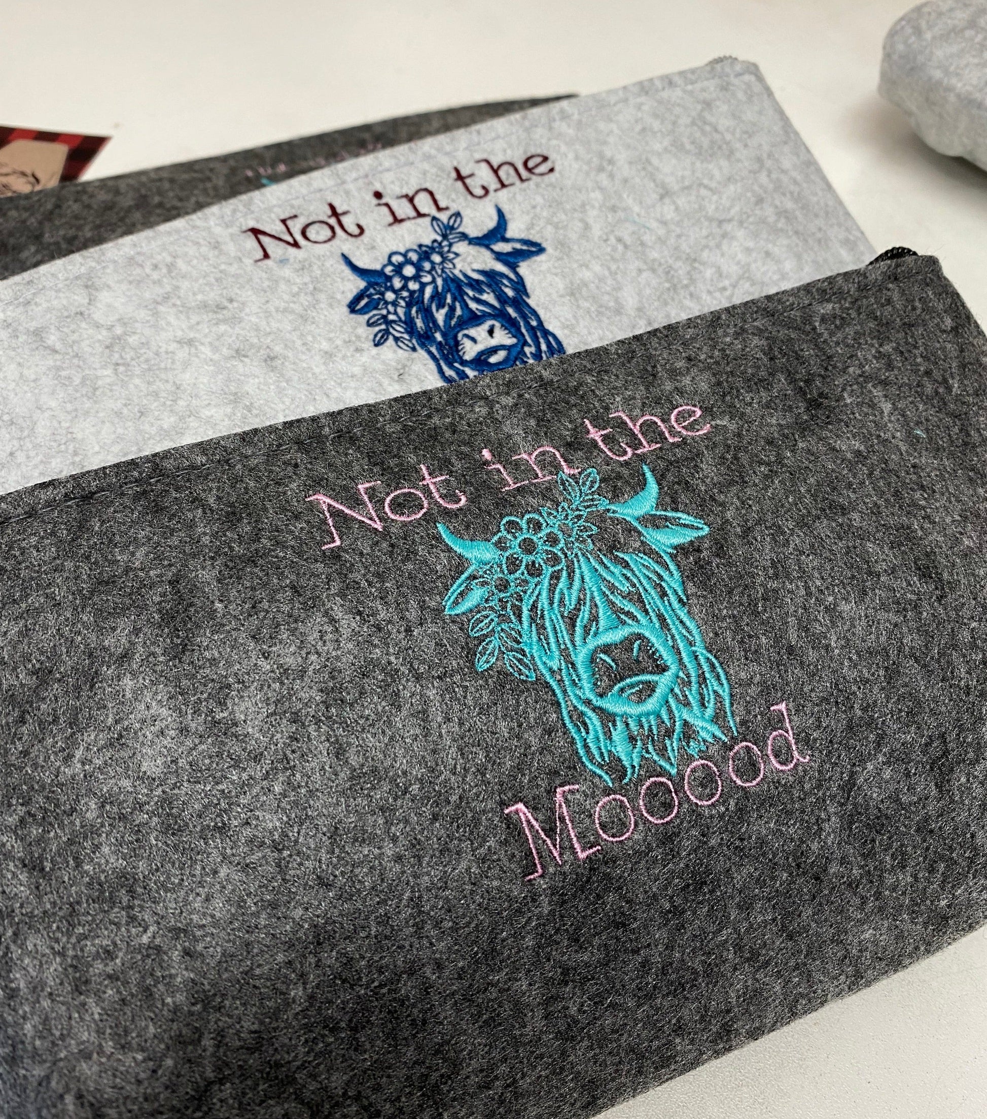 "Not in the Mooood" Highland Cow Embroidered Felt Zipper Pouch