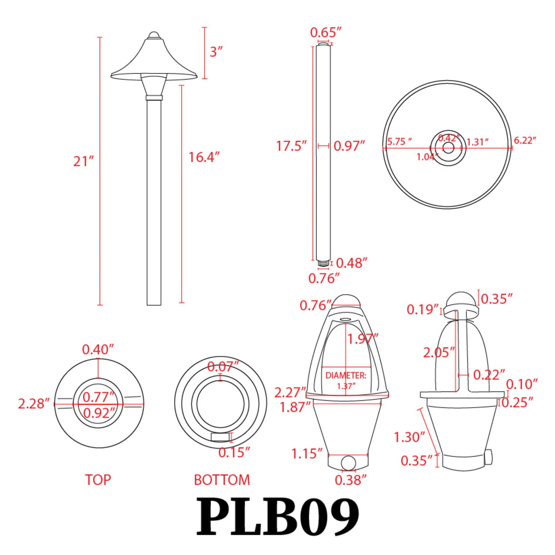 The PLB09 LED brass landscape lighting path & area light with ABS ground spike stake with cone hat consumes less energy than incandescent lights and is IP65 waterproof, making it a reliable and cost-saving landscape lighting fixture for your home's exterior space. This high-quality antique style led pathway light is made of heavy-duty cast brass, giving it a solid construction for durability and a lifetime of beauty. Its hat size is 6" x 3" and pole size is 18".